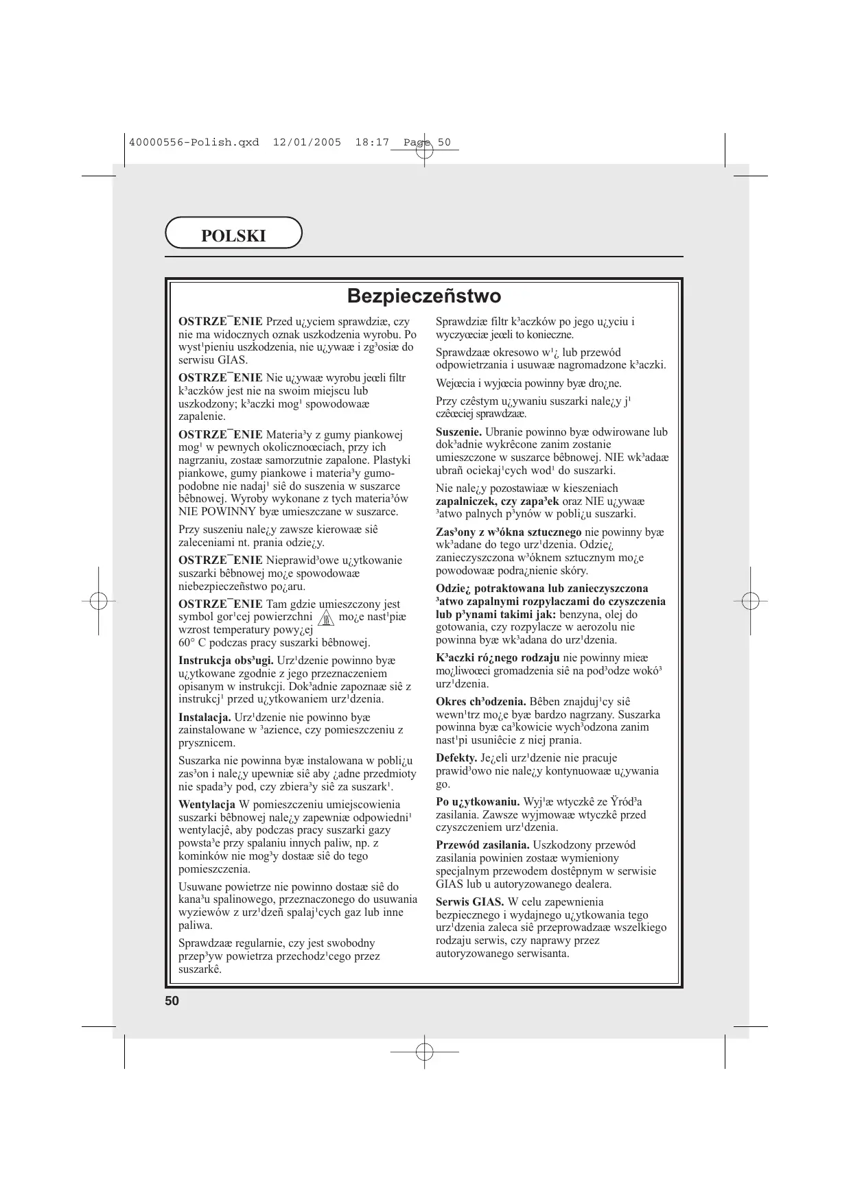 Il est nécessaire d’inspecter régulièrement le tuyau ou la conduite de ventilation et d’éliminer les accumulations éventuelles de peluches. Les entrées et sorties doivent être libres d’obstructions. Si le sèche-linge est utilisé fréquemment, les intervalles entre les inspections doivent être réduits en conséquence. Degré de séchage. Les vêtements doivent être essorés en machine ou à la main avant d’être placés dans le sèche-linge. Les vêtements qui dégoulinent NE DOIVENT PAS être mis dans le sèche-linge. Enlevez les briquets et les allumettes des poches et veillez à ne JAMAIS utiliser de liquides inflammables à proximité de la machine. Les rideaux en fibres de verre ne doivent jamais être placés dans cette machine. La contamination d’autres vêtements par les fibres de verre peut entraîner des irritations de la peau. Les vêtements traités ou contaminés par des produits de nettoyage ou des liquides inflammables, comme le pétrole, l’huile de cuisson ou les aérosols ne doivent pas être placés dans la machine. Veillez à ce que les peluches ne puissent pas s’accumuler sur le sol, à l’extérieur de la machine. Période de refroidissement. Il se peut que l’intérieur du tambour soit très chaud. Veillez à ce que le sèche-linge termine son cycle de refroidissement avant d’en sortir le linge. Pannes. Cessez d’utiliser la machine si elle semble défectueuse. Après usage. Débranchez du courant de secteur. Retirez toujours la prise avant de nettoyer la machine. Cordon d’alimentation. Si le cordon d’alimentation de cet appareil est endommagé, il doit être remplacé par un cordon spécial exclusivement disponible auprès de GIAS Service ou d’un distributeur agréé. Service GIAS. Pour veiller au fonctionnement sûr et efficace de cet appareil, il est conseillé de faire appel à un technicien agréé pour les entretiens et les réparations.
