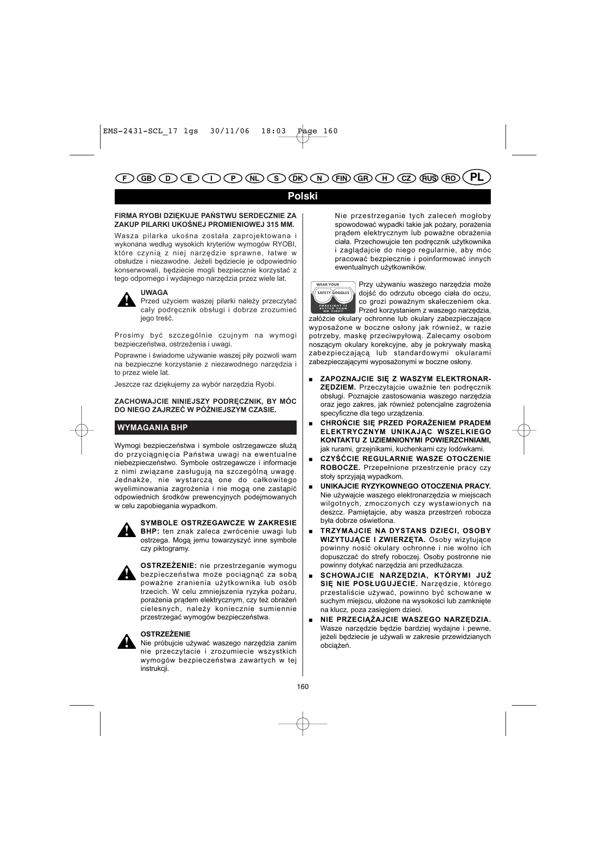 BHP: ten znak zaleca zwrécenie uwagi lub ostrzega. Moga jemu towarzyszyé inne symbole ezy piktogramy. bezpieczeñstwa moze pociagnaé za soba powazne zranienia uytkownika lub oséb tzecich. W celu zmniejszenia ryzyka pozaru, porazenia pradem elektrycznym, czy tez obrazeñ cielesnych, nalezy koniecznie sumiennie przestrzegaé wymogéw bezpieczeñstwa. i OSTRZEZENIE: nie przestrzeganie wymogu OSTRZEZENIE PIN Nie prébujcie u2ywaé waszego narzedzia zanim nie przeczytacie i zrozumiecie wszystkich wymogéw bezpieczeñstwa zawartych w tej instrukcji Nie przestrzeganie tych zaleceñ mogloby spowodowaé wypadki takie jak poary, porazenia pradem elektrycznym lub powazne obrazenia ciala. Przechowujcie ten podrecznik uzytkownika i zagladajcie do niego regularnie, aby méc pracowaé bezpiecznie i poinformowaé innych ewentualnych u2ytkownikôw. Przy u2ywaniu waszego narzedzia moe dojéé do odrzutu obcego ciala do oczu, co grozi powaznym skaleczeniem oka. Przed korzystaniem z waszego narzedzia, zaléicie okulary ochronne lub okulary zabezpieczajace wyposazone w boczne oslony jak réwniez, w razie potrzeby, maske przeciwpylowa. Zalecamy osobom noszacym okulary korekcyjne, aby je pokrywaly maska zabezpieczajaca lub standardowymi okularami zabezpieczajacymi wyposazonymi w boczne oslony.