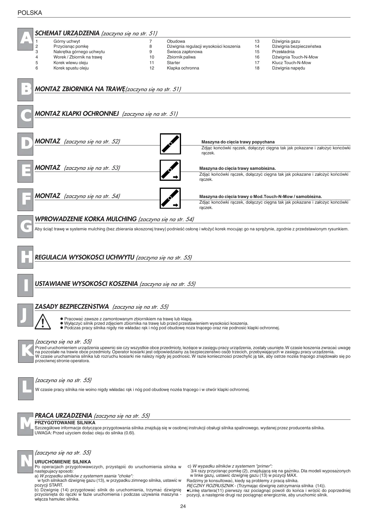 Dz>wignia gazu Dz>wignia bezpieczen>stwa PrzeklÀadnia Dwignia Touch-N-Mow Klucz Touch-N-Mow Dz>wignia nape%du Maszyna do cie%cia trawy popychana Zdja%c> kon>cówki ra%czek, dolÀa%czyc> cie%gna tak jak pokazane i zalÀozéyc> kon>cówki ra%czek. Maszyna do cie%cia trawy samobiezéna. Zdja%c> kon>cówki ra%czek, dolÀa%czyc> cie%gna tak jak pokazane i zalÀozéyc> kon>cówki ra%czek. Maszyna do cie%cia trawy o Mod.Touch-N-Mow / samobiezéna. Zdja%c> kon>cówki ra%czek, dolÀa%czyc> cie%gna tak jak pokazane i zalÀozéyc> kon>cówki ra%czek. WPROWADZENIE KORKA MULCHING (zaczyna sie% na str. 54) Aby ci¹æ trawê w systemie mulching (bez zbierania skoszonej trawy) podnieæ os³onê i w³o¿yæ korek mocuj¹c go na sprê¿ynie, zgodnie z przedstawionym rysunkiem. REGULACJA WYSOKOSéCI UCHWYTU (zaczyna sie% na str. 55) USTAWIANIE WYSOKOSéCI KOSZENIA (zaczyna sie% na str. 55) ZASADY BEZPIECZEN>STWA (zaczyna sie% na str. 55) l Pracowac> zawsze z zamontowanym zbiornikiem na trawe% lub klapa%. l WylÀa%czyc> silnik przed zdje%ciem zbiornika na trawe% lub przed przestawieniem wysokos>ci koszenia. l Podczas pracy silnika nigdy nie wklÀadac ra%k i nóg pod obudowe% noza tna%cego oraz nie podnosic> klapki ochronnej. (zaczyna sie% na str. 55) Przed uruchomieniem urza%dzenia upewnic sie czy wszystkie obce przedmioty, lezéa%ce w zasie%gu pracy urza%dzenia, zostalÀy usunie%te. W czasie koszenia zwracac> uwage% na pozostalÀe na trawie obce przedmioty. Operator kosiarki jest odpowiedziainy za bezpieczen>stwo osób trzecich, przebywaja%cych w zasie%gu pracy urza%dzenia. W czasie uruchamiania silnika lub rozruchu kosiarki nie nalezéy nigdy jej podnosic>. W razie koniecznos>ci przechylic> ja% tak, aby ostrze nozéa tna%cego znajdowalÀo sie% po przeciwnej stronie operatora. (zaczyna sie% na str. 55) W czasie pracy silnika nie woino nigdy wklÀadac ra%k i nóg pod obudowe% nozéa tna%cego i w otwór klapki ochronnej. PRACA URZA%DZENIA (zaczyna sie% na str. 55) PRZYGOTOWANIE SILNIKA SzczególÀowe informacje dotycza%ce przygotowania silnika znajduja% sie% w osobnej instrukcji obslÀugi silnika spalinowego, wydanej przez producenta silnika. UWAGA: Przed uzéyciem dodac> oleju do silnika (0.6l). (zaczyna sie% na str. 55) URUCHOMIENIE SILNIKA Po operacjach przygotowawczych, przysta%pic> do uruchomienia silnika w naste%pujacy sposob: a) W przpadku silników z systemem ssania "choke": w tych silnikach dz>wignie% gazu (13), w przypadku zimnego silnika, ustawic> w pozycji START. b) Dz>wignie% (14) przygotowac> silnik do uruchomienia, trzymac> dzéwignie% przycis>nie%ta do ra%czki w fazie uruchomienia i podczas uzéywania maszyna wlÀa%cza hamulec silnika.