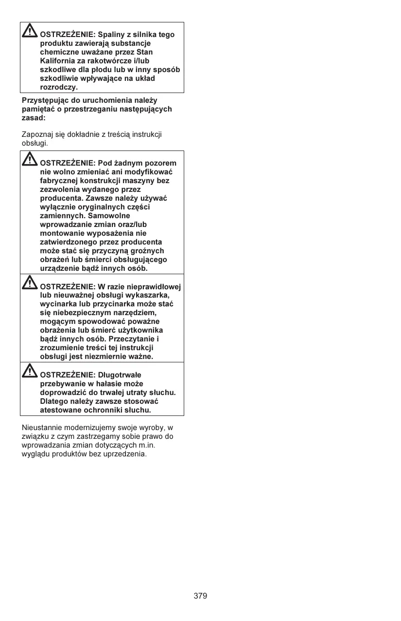 Contrôler les points suivants avant la mise en marche : Lisez attentivement le manuel d’utilisation. AVERTISSEMENT : Ne jamais modifier sous aucun prétexte la machine sans l’autorisation du fabricant. N’utiliser que des accessoires et des pièces d’origine. Des modifications nonautorisées et l’emploi d’accessoires non-homologués peuvent provoquer des accidents graves et même mortels, à l’utilisateur ou d’autres personnes. AVERTISSEMENT : Utilisés de manière négligente ou erronée, les scies d'éclaircissement et les coupe-herbes peuvent devenir des outils dangereux pouvant occasionner des blessures très graves, voire mortelles à l’utilisateur ou à d’autres personnes présentes. Il est très important de lire attentivement et de bien assimiler le contenu de ce manuel de l'opérateur. AVERTISSEMENT : Une exposition prolongée au bruit risque de causer des lésions auditives permanentes. Toujours utiliser des protecteurs d'oreilles agréés. Nous travaillons continuellement au développement de ses produits et nous réservons le droit d’en modifier, entre autres, la conception et l’aspect sans préavis.