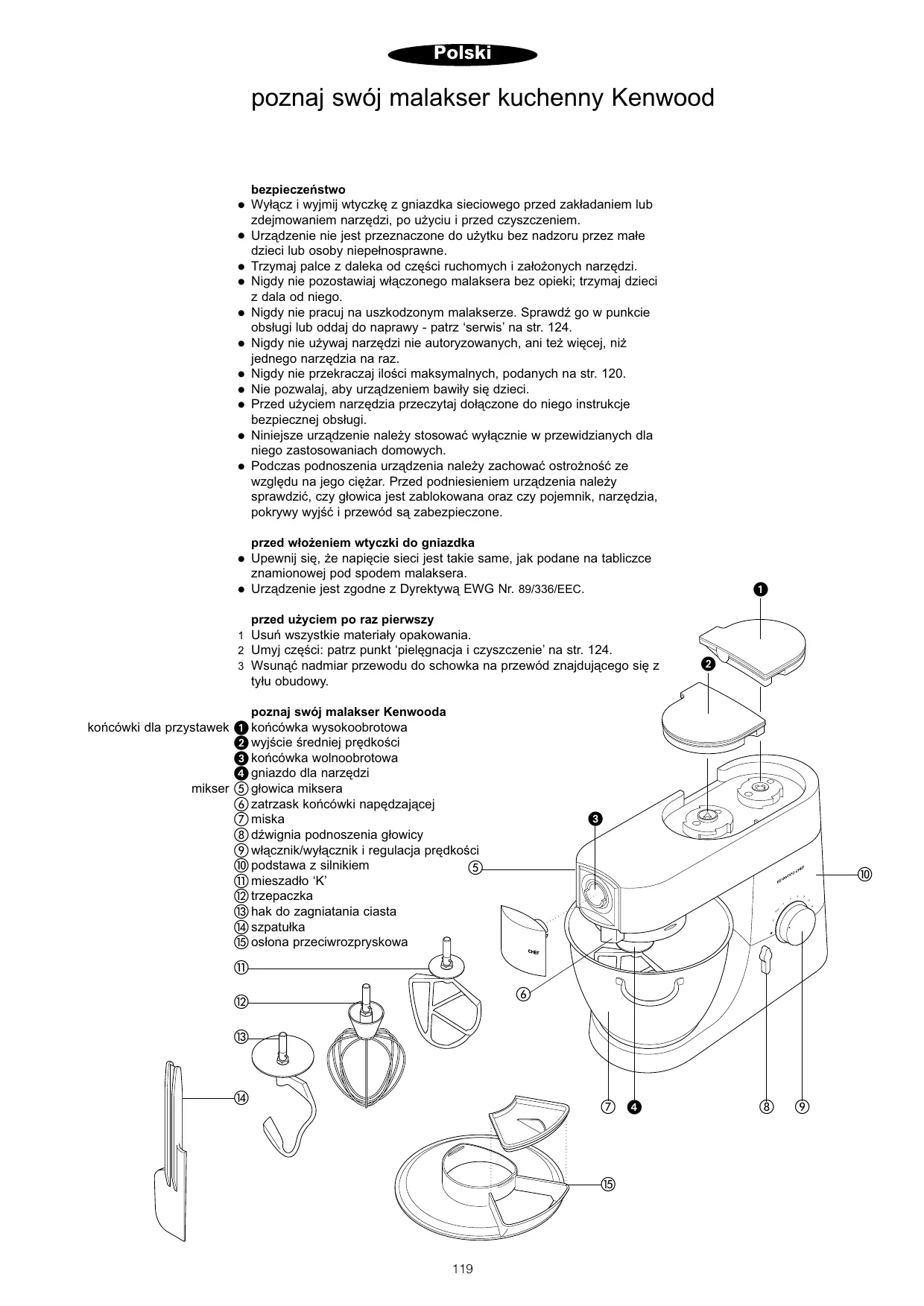 poznaj swôj malakser kuchenny Kenwood bezpieczeñstwo e Wylacz i wyimi wtyczke z gniazdka sieciowego przed zakladaniem lub zdejmowaniem narzedzi, po u2yciu i przed czyszczeniem. e Urzadzenie nie jest przeznaczone do uzytku bez nadzoru przez male dzieci lub osoby niepelnosprawne. e Trzymaj palce z daleka od czeéci ruchomych i zalozonych narzedzi. e Nigdy nie pozostawia wlaczonego malaksera bez opieki: trzymaj dzieci z dala od niego. e Nigdy nie pracuj na uszkodzonym malakserze. Sprawd£ go w punkcie obslugi lub oddaj do naprawy - patrz ‘serwis' na str. 124. e Nigdy nie u2ywaj narzedzi nie autoryzowanych, ani teZ wiecej, niz jednego narzedzia na raz. e Nigdy nie przekraczaj iloéci maksymalnych, podanych na str. 120. e Nie pozwalaj, aby urzadzeniem bawily sie dzieci. e Przed uzyciem narzedzia przeczytai dolaczone do niego instrukcje bezpieczne) obslugi. e Niniejsze urzadzenie nalezy stosowaé wylacznie w przewidzianych dla niego zastosowaniach domowych. e Podezas podnoszenia urzadzenia nalezy zachowaé ostroëno$é ze wzgledu na jego ciezar. Przed podniesieniem urzadzenia nalezy sprawdzié, czy glowica jest zablokowana oraz czy pojemnik, narzedzia, pokrywy wyjéé i przewéd sa zabezpieczone. przed wlozeniem wtyczki do gniazdka e Upewnij sie, Ze napiecie sieci jest takie same, jak podane na tabliczce znamionowej pod spodem malaksera. e Urzadzenie jest zgodne z Dyrektywa EWG Nr. 89/336/EEC. przed uyciem po raz pierwszy 1 Usuñ wszystkie materiaty opakowania. 2 Umyj czeéci: patrz punkt ‘pielegnacja i czyszczenie’ na str. 124. 3 Wsunaé nadmiar przewodu do schowka na przewéd znajdujacego sie z tylu obudowy. poznaj swéj malakser Kenwooda koricéwki dia przystawek @ koñcwka wysokoobrotowa Se éredniej predkoéci koñcéwka wolnoobrotowa gniazdo dla narzedzi mikser 6) glowica miksera @ zatrzask koñcwki napedzajacej @miska @® déwignia podnoszenia glowicy © wtacznikwylacznik i regulacja predkoéci © podstawa z silnikiem @mieszadlo K' @trzepaczka @ hak do zagniatania ciasta @ szpatuka @ oslona przeciwrozpryskowa