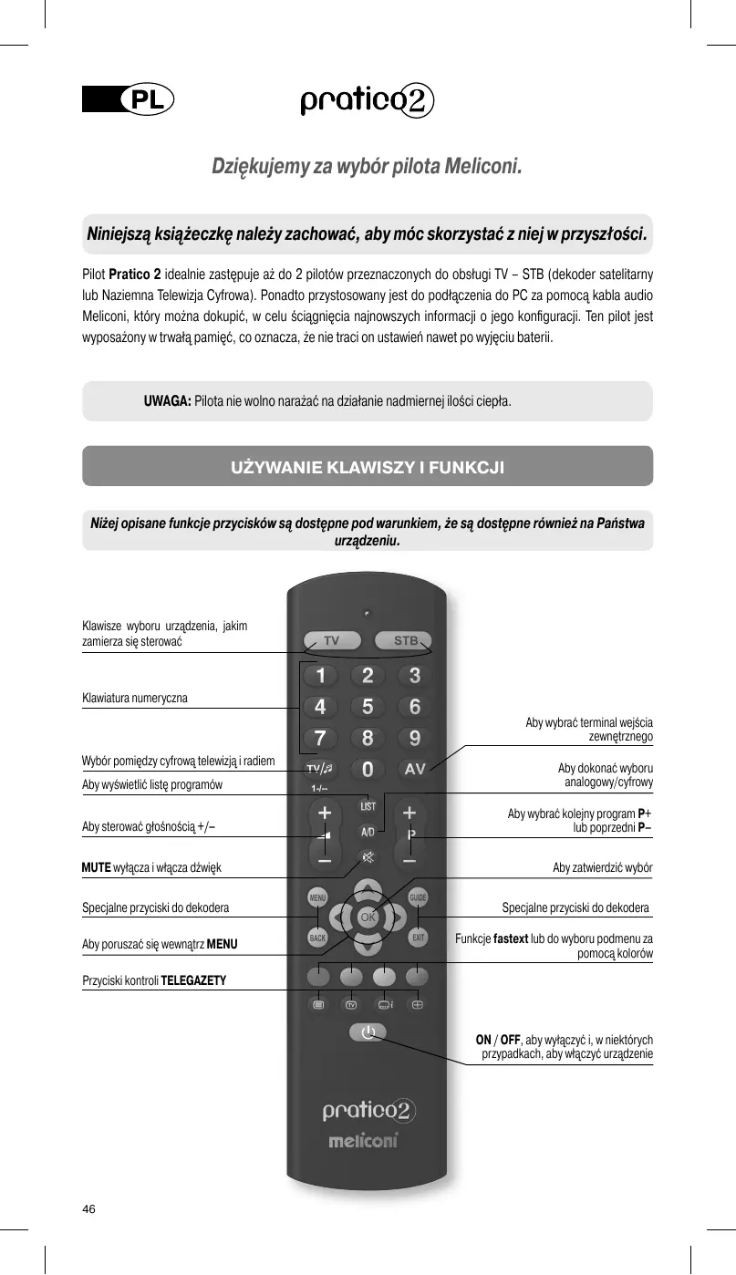 Dziękujemy za wybór pilota Meliconi. Niniejszą książeczkę należy zachować, aby móc skorzystać z niej w przyszłości. Pilot Pratico 2 idealnie zastępuje aż do 2 pilotów przeznaczonych do obsługi TV – STB (dekoder satelitarny lub Naziemna Telewizja Cyfrowa). Ponadto przystosowany jest do podłączenia do PC za pomocą kabla audio Meliconi, który można dokupić, w celu ściągnięcia najnowszych informacji o jego konfiguracji. Ten pilot jest wyposażony w trwałą pamięć, co oznacza, że nie traci on ustawień nawet po wyjęciu baterii. UWAGA: Pilota nie wolno narażać na działanie nadmiernej ilości ciepła.