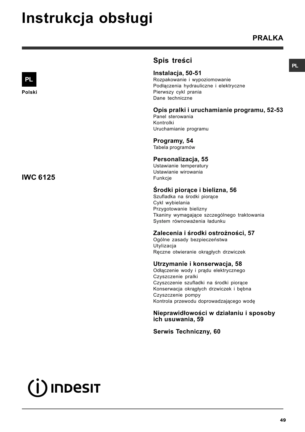 IWC 6125 - Pralka INDESIT - Bezpłatna instrukcja obsługi