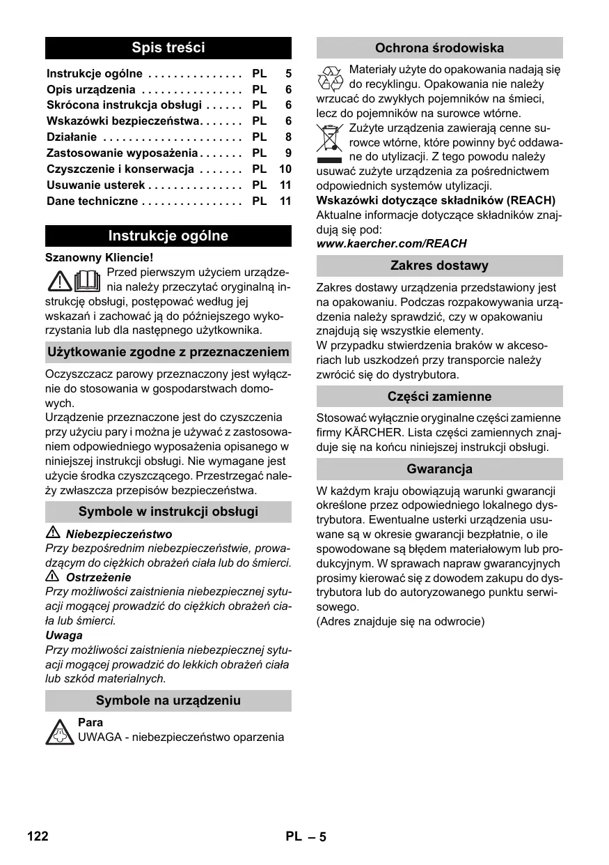Instrukcje ogólne Szanowny Kliencie! Przed pierwszym użyciem urządzenia należy przeczytać oryginalną instrukcję obsługi, postępować według jej wskazań i zachować ją do późniejszego wykorzystania lub dla następnego użytkownika. Użytkowanie zgodne z przeznaczeniem Oczyszczacz parowy przeznaczony jest wyłącznie do stosowania w gospodarstwach domowych. Urządzenie przeznaczone jest do czyszczenia przy użyciu pary i można je używać z zastosowaniem odpowiedniego wyposażenia opisanego w niniejszej instrukcji obsługi. Nie wymagane jest użycie środka czyszczącego. Przestrzegać należy zwłaszcza przepisów bezpieczeństwa. Symbole w instrukcji obsługi Niebezpieczeństwo Przy bezpośrednim niebezpieczeństwie, prowadzącym do ciężkich obrażeń ciała lub do śmierci. 몇 Ostrzeżenie Przy możliwości zaistnienia niebezpiecznej sytuacji mogącej prowadzić do ciężkich obrażeń ciała lub śmierci. Uwaga Przy możliwości zaistnienia niebezpiecznej sytuacji mogącej prowadzić do lekkich obrażeń ciała lub szkód materialnych. Materiały użyte do opakowania nadają się do recyklingu. Opakowania nie należy wrzucać do zwykłych pojemników na śmieci, lecz do pojemników na surowce wtórne. Zużyte urządzenia zawierają cenne surowce wtórne, które powinny być oddawane do utylizacji. Z tego powodu należy usuwać zużyte urządzenia za pośrednictwem odpowiednich systemów utylizacji. Wskazówki dotyczące składników (REACH) Aktualne informacje dotyczące składników znajdują się pod: www.kaercher.com/REACH Zakres dostawy Zakres dostawy urządzenia przedstawiony jest na opakowaniu. Podczas rozpakowywania urządzenia należy sprawdzić, czy w opakowaniu znajdują się wszystkie elementy. W przypadku stwierdzenia braków w akcesoriach lub uszkodzeń przy transporcie należy zwrócić się do dystrybutora. Części zamienne Stosować wyłącznie oryginalne części zamienne firmy KÄRCHER. Lista części zamiennych znajduje się na końcu niniejszej instrukcji obsługi. Gwarancja W każdym kraju obowiązują warunki gwarancji określone przez odpowiedniego lokalnego dystrybutora. Ewentualne usterki urządzenia usuwane są w okresie gwarancji bezpłatnie, o ile spowodowane są błędem materiałowym lub produkcyjnym. W sprawach napraw gwarancyjnych prosimy kierować się z dowodem zakupu do dystrybutora lub do autoryzowanego punktu serwisowego. (Adres znajduje się na odwrocie) Symbole na urządzeniu Para UWAGA - niebezpieczeństwo oparzenia