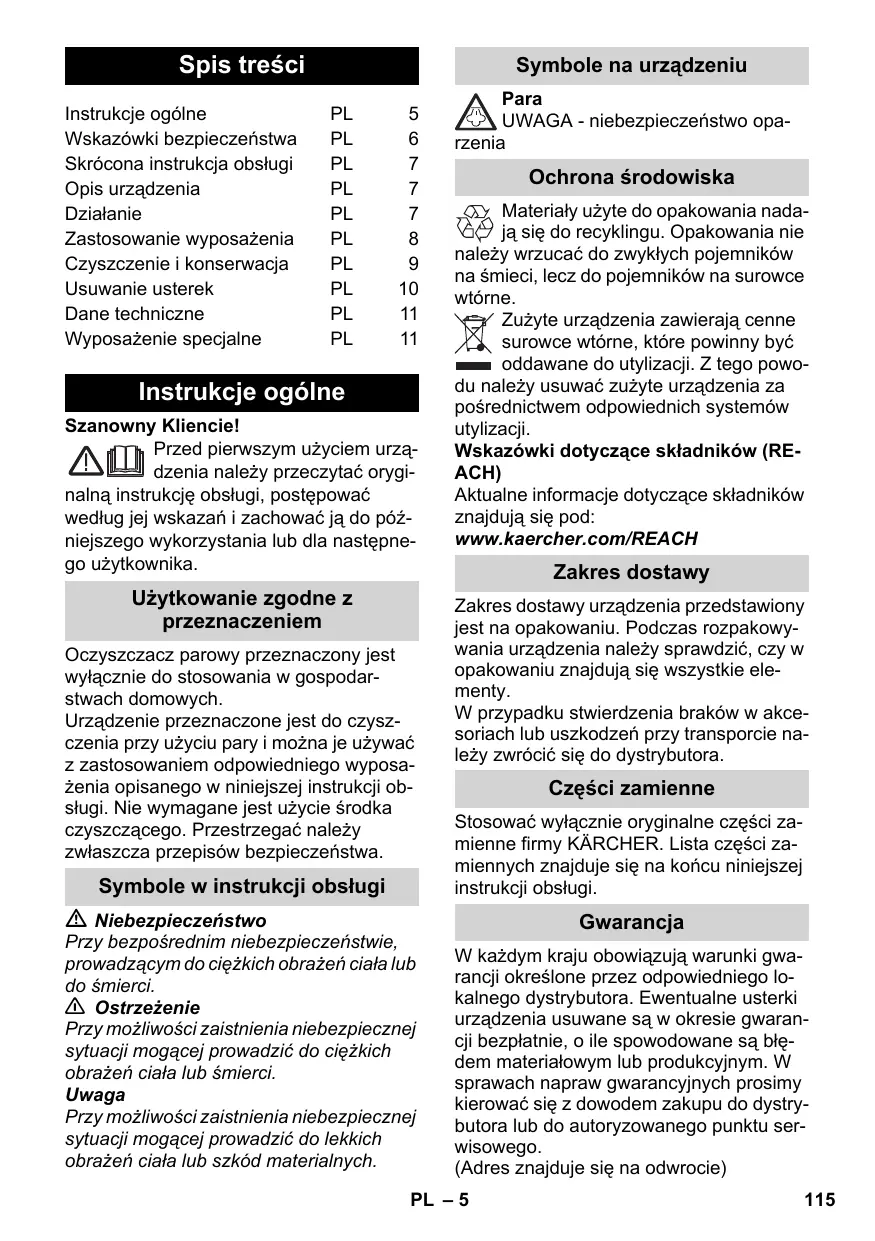 Instrukcje ogólne Szanowny Kliencie! Przed pierwszym użyciem urządzenia należy przeczytać oryginalną instrukcję obsługi, postępować według jej wskazań i zachować ją do późniejszego wykorzystania lub dla następnego użytkownika. Użytkowanie zgodne z przeznaczeniem Oczyszczacz parowy przeznaczony jest wyłącznie do stosowania w gospodarstwach domowych. Urządzenie przeznaczone jest do czyszczenia przy użyciu pary i można je używać z zastosowaniem odpowiedniego wyposażenia opisanego w niniejszej instrukcji obsługi. Nie wymagane jest użycie środka czyszczącego. Przestrzegać należy zwłaszcza przepisów bezpieczeństwa. Symbole w instrukcji obsługi Niebezpieczeństwo Przy bezpośrednim niebezpieczeństwie, prowadzącym do ciężkich obrażeń ciała lub do śmierci. 몇 Ostrzeżenie Przy możliwości zaistnienia niebezpiecznej sytuacji mogącej prowadzić do ciężkich obrażeń ciała lub śmierci. Uwaga Przy możliwości zaistnienia niebezpiecznej sytuacji mogącej prowadzić do lekkich obrażeń ciała lub szkód materialnych. Para UWAGA - niebezpieczeństwo oparzenia Ochrona środowiska Materiały użyte do opakowania nadają się do recyklingu. Opakowania nie należy wrzucać do zwykłych pojemników na śmieci, lecz do pojemników na surowce wtórne. Zużyte urządzenia zawierają cenne surowce wtórne, które powinny być oddawane do utylizacji. Z tego powodu należy usuwać zużyte urządzenia za pośrednictwem odpowiednich systemów utylizacji. Wskazówki dotyczące składników (REACH) Aktualne informacje dotyczące składników znajdują się pod: www.kaercher.com/REACH Zakres dostawy Zakres dostawy urządzenia przedstawiony jest na opakowaniu. Podczas rozpakowywania urządzenia należy sprawdzić, czy w opakowaniu znajdują się wszystkie elementy. W przypadku stwierdzenia braków w akcesoriach lub uszkodzeń przy transporcie należy zwrócić się do dystrybutora. Części zamienne Stosować wyłącznie oryginalne części zamienne firmy KÄRCHER. Lista części zamiennych znajduje się na końcu niniejszej instrukcji obsługi. Gwarancja W każdym kraju obowiązują warunki gwarancji określone przez odpowiedniego lokalnego dystrybutora. Ewentualne usterki urządzenia usuwane są w okresie gwarancji bezpłatnie, o ile spowodowane są błędem materiałowym lub produkcyjnym. W sprawach napraw gwarancyjnych prosimy kierować się z dowodem zakupu do dystrybutora lub do autoryzowanego punktu serwisowego. (Adres znajduje się na odwrocie) PL – 5