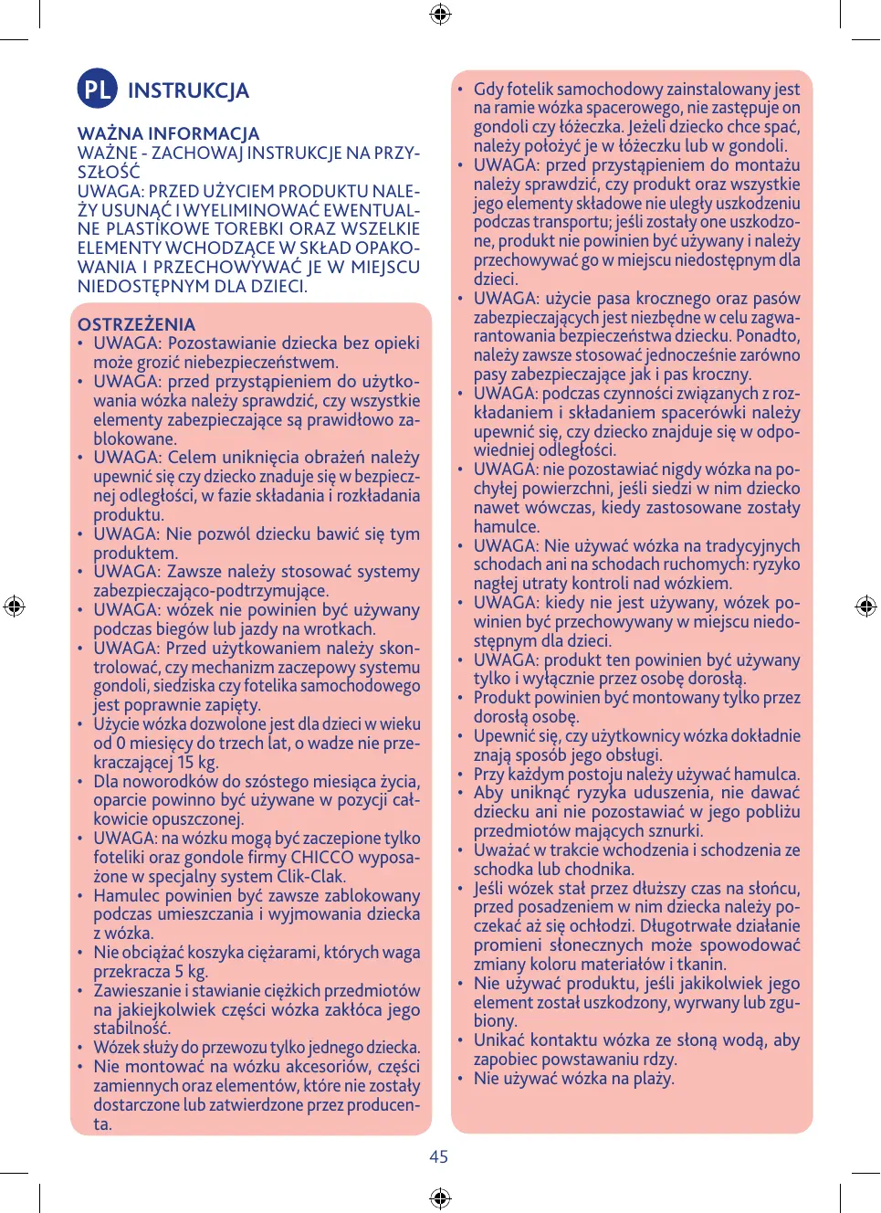 · AVERTISSEMENT : S’assurer que tous les dispositifs de verrouillage sont enclenchés avant utilisation · AVERTISSEMENT : Pour éviter toute blessure, maintenir votre enfant à l’écart lors du dépliage et du pliage du produit · AVERTISSEMENT : Ne pas laisser votre enfant jouer avec ce produit · AVERTISSEMENT : Toujours utiliser le système de retenue. · AVERTISSEMENT : Ce produit ne convient pas pour faire du jogging ou des promenades en rollers. · AVERTISSEMENT : Vérifier que les dispositifs de fixation de la nacelle, du siège ou du siègeauto sont correctement enclenchés avant utilisation · L’utilisation de la poussette est autorisée avec les enfants d’un âge compris entre 0 et 36 mois, jusqu’à un poids maximum de 15 kg. · De la naissance de l’enfant à ses 6 mois environ, le dossier doit être utilisé complètement incliné. · Seul siege d’auto CHICCO et/ou la nacelle CHICCO avec le dispositif spécial CLIK CLAK, peut être attaché à la poussette compatible. · Le système de freinage doit être actionné avant de positionner ou retirer l’enfant. · Ne pas mettre dans le panier de poids supérieur à 5 kg. · Tout poids suspendu aux poignées et/ou au dossier et/ou sur les côtés de la pous14