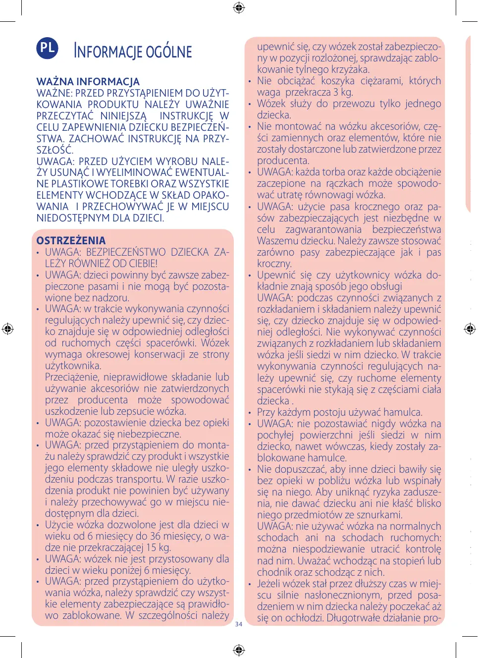 + AVERTISSEMENT : LA SÉCURITÉ DE L'EN- FANT DÉPEND AUSSI DE VOUS ! + AVERTISSEMENT: les enfants doivent tou- jours etre attaches avec Les ceintures de se- curite et ne doivent jamais etre laisses sans surveillance. AVERTISSEMENT : pendant le réglage, tenir l'enfant éloignés des parties mobiles de La poussette. Cette poussette doit être entre- tenue régulièrement par l'utilisateur. Surcharger la poussette, ne pas La plier cor- rectement et utiliser des accessoires non approuvés pourraient endommager ou cas- ser la poussette. AVERTISSEMENT : il peut être dangereux de laisser l'enfant sans surveillance. AVERTISSEMENT : après avoir déballer La poussette, vérifier l'état du produit et de tous ses composants pour s'assurer qu'ils n'ont pas été endommagés lors du trans- port. Dans ce cas, le produit ne doit pas être utilisé et il devra être tenu hors de portée des enfants. L'utilisation de la poussette est prévue pour des enfants de 6 à 36 mois, jusqu'à 15 kg. AVERTISSEMENT : cette poussette n'est pas adaptée aux enfants de moins de 6 mois. AVERTISSEMENT : avant l'utilisation, s'assurer que tous les mécanismes de ver- rouillage sont correctement enclenchés. Vérifier, notamment, que la poussette est