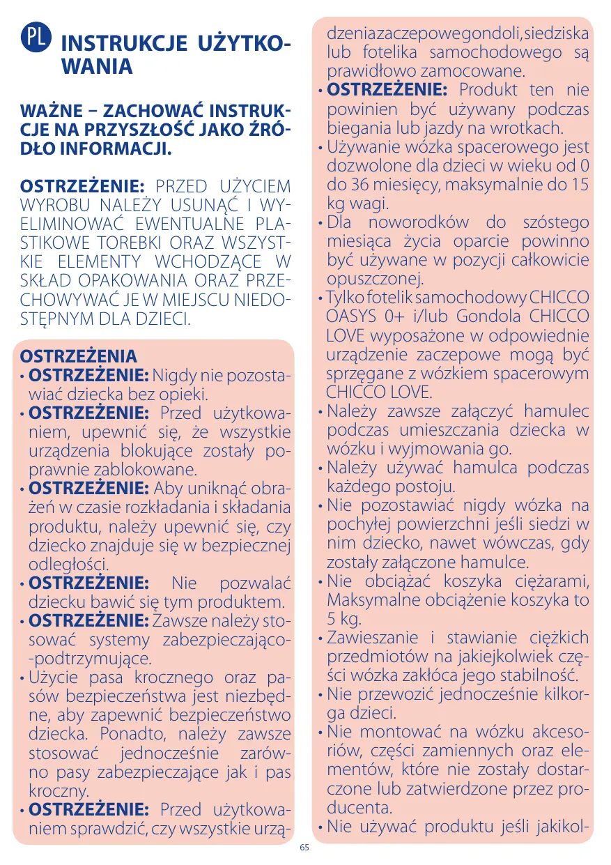 dzenia zaczepowe gondoli, siedziska MVC GPUFMJLB TBNPDIPEPXFHP TLJ prawidłowo zamocowane. rO STRZEŻENIE: Produkt ten nie powinien być używany podczas biegania lub jazdy na wrotkach. r6ȃZXBOJFXÓ[LBTQBDFSPXFHPKFTU dozwolone dla dzieci w wieku od 0 do 36 miesięcy, maksymalnie do 15 kg wagi. r%MB OPXPSPELÓX EP T[ÓTUFHP miesiąca życia oparcie powinno być używane w pozycji całkowicie opuszczonej. r5ZMLPGPUFMJLTBNPDIPEPXZ$)*$$0 OASYS 0+ i/lub Gondola CHICCO LOVE wyposażone w odpowiednie urządzenie zaczepowe mogą być sprzęgane z wózkiem spacerowym CHICCO LOVE. r/BMFȃZ [BXT[F [BLJD[Zlj IBNVMFD podczas umieszczania dziecka w wózku i wyjmowania go. r/BMFȃZ VȃZXBlj IBNVMDB QPED[BT każdego postoju. r/JF QP[PTUBXJBlj OJHEZ XÓ[LB OB pochyłej powierzchni jeśli siedzi w nim dziecko, nawet wówczas, gdy zostały załączone hamulce. r/JF PCDJLJȃBlj LPT[ZLB DJǒȃBSBNJ Maksymalne obciążenie koszyka to 5 kg. r;BXJFT[BOJF J TUBXJBOJF DJǒȃLJDI przedmiotów na jakiejkolwiek części wózka zakłóca jego stabilność. r/JFQS[FXP[JljKFEOPD[FǯOJFLJMLPSga dzieci. r/JF NPOUPXBlj OB XÓ[LV BLDFTPriów, części zamiennych oraz elementów, które nie zostały dostarczone lub zatwierdzone przez producenta. r/JF VȃZXBlj QSPEVLUV KFǯMJ KBLJLPM-