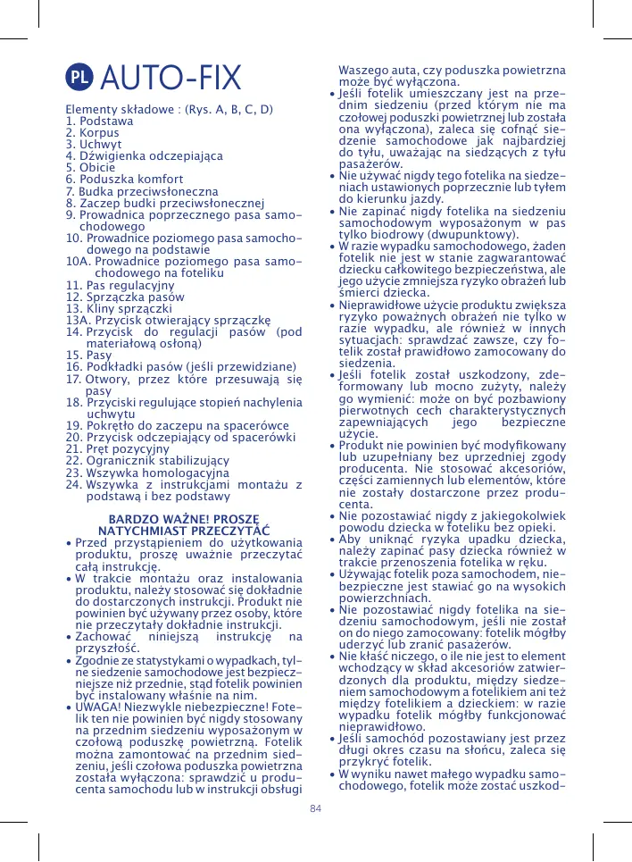 AUTO-FIX Elementy składowe : (Rys. A, B, C, D) 1. Podstawa 2. Korpus 3. Uchwyt 4. Dźwigienka odczepiająca 5. Obicie 6. Poduszka komfort 7. Budka przeciwsłoneczna 8. Zaczep budki przeciwsłonecznej 9. Prowadnica poprzecznego pasa samochodowego 10. Prowadnice poziomego pasa samochodowego na podstawie 10A. Prowadnice poziomego pasa samochodowego na foteliku 11. Pas regulacyjny 12. Sprzączka pasów 13. Kliny sprzączki 13A. Przycisk otwierający sprzączkę 14. Przycisk do regulacji pasów (pod materiałową osłoną) 15. Pasy 16. Podkładki pasów (jeśli przewidziane) 17. Otwory, przez które przesuwają się pasy 18. Przyciski regulujące stopień nachylenia uchwytu 19. Pokrętło do zaczepu na spacerówce 20. Przycisk odczepiający od spacerówki 21. Pręt pozycyjny 22. Ogranicznik stabilizujący 23. Wszywka homologacyjna 24. Wszywka z instrukcjami montażu z podstawą i bez podstawy BARDZO WAŻNE! PROSZĘ NATYCHMIAST PRZECZYTAĆ • Przed przystąpieniem do użytkowania produktu, proszę uważnie przeczytać całą instrukcję. • W trakcie montażu oraz instalowania produktu, należy stosować się dokładnie do dostarczonych instrukcji. Produkt nie powinien być używany przez osoby, które nie przeczytały dokładnie instrukcji. • Zachować niniejszą instrukcję na przyszłość. • Zgodnie ze statystykami o wypadkach, tylne siedzenie samochodowe jest bezpieczniejsze niż przednie, stąd fotelik powinien być instalowany właśnie na nim. • UWAGA! Niezwykle niebezpieczne! Fotelik ten nie powinien być nigdy stosowany na przednim siedzeniu wyposażonym w czołową poduszkę powietrzną. Fotelik można zamontować na przednim siedzeniu, jeśli czołowa poduszka powietrzna została wyłączona: sprawdzić u producenta samochodu lub w instrukcji obsługi 84