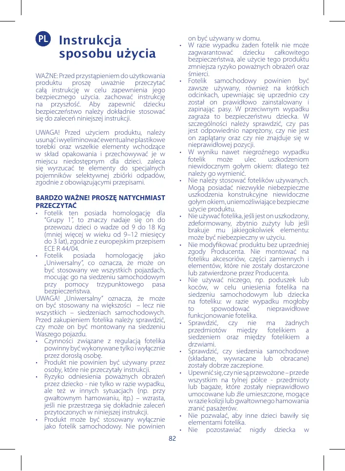 • Ce siège-auto est homologué “Universel” et peut donc être installé sur la quasi totalité des véhicules en l’accrochant à l’aide de la ceinture à trois points du siège de la voiture. ATTENTION ! “Universel” signifie qu’il est compatible avec la plupart des véhicules – ce qui ne signifie pas tous les véhicules. Il faut donc vérifier la compatibilité du siège-auto avec votre voiture avant l’achat. • Le réglage du siège-auto doit être fait uniquement par un adulte. • Ne pas utiliser ce produit sans avoir préalablement lu les instructions. • Le risque de dommages graves pour l’enfant augmente si les indications de cette notice ne sont pas suivies scrupuleusement. Ce risque n’intervient pas uniquement en cas d’accident, mais aussi dans d’autres situations (ex. freinages brusques, etc.). • Le produit est exclusivement destiné à servir de siège-auto. Il n’est pas prévu pour une utilisation à la maison, ou aucune autre utilisation. • Aucun siège-auto ne peut garantir la sécurité totale de l’enfant en cas d’accident,