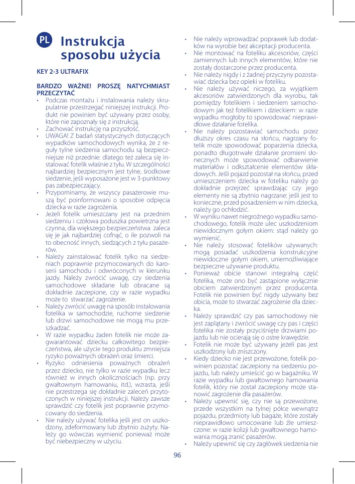 UWAGA! Niniejsze instrukcje omawiają zarówno w tekście jak i rysunkach sposób instalowania fotelika na tylnym prawym siedzeniu. Aby zainstalować fotelik w innej pozycji, należy wykonać tą samą kolejność czynności. WAŻNE! Fotelik MUSI być instalowany ZAWSZE z pasem bezpieczeństwa samochodu. Łączniki Ultrafix są w stosunku do pasów pojazdu, dodatkowymi urządzeniami zabezpieczającymi, polepszającymi stabilność fotelika.
