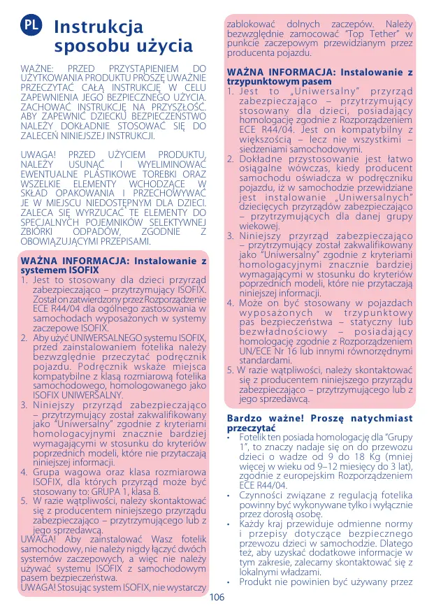WAŻNA INFORMACJA: Instalowanie z trzypunktowym pasem 1. J e s t t o „ U n i w e r s a l n y ” p r z y r z ą d zabezpieczająco – przytrzymujący stosowany dla dzieci, posiadający homologację zgodnie z Rozporządzeniem ECE R44/04. Jest on kompatybilny z większością – lecz nie wszystkimi – siedzeniami samochodowymi. 2. Dokładne przystosowanie jest łatwo osiągalne wówczas, kiedy producent samochodu oświadcza w podręczniku pojazdu, iż w samochodzie przewidziane jest instalowanie „Uniwersalnych” dziecięcych przyrządów zabezpieczająco – przytrzymujących dla danej grupy wiekowej. 3. Niniejszy przyrząd zabezpieczająco – przytrzymujący został zakwalifikowany jako “Uniwersalny” zgodnie z kryteriami homologacyjnymi znacznie bardziej wymagającymi w stosunku do kryteriów poprzednich modeli, które nie przytaczają niniejszej informacji. 4. Może on być stosowany w pojazdach wyposażonych w trzypunktowy pas bezpieczeństwa – statyczny lub bezwładnościowy – posiadający homologację zgodnie z Rozporządzeniem UN/ECE Nr 16 lub innymi równorzędnymi standardami. 5. W razie wątpliwości, należy skontaktować się z producentem niniejszego przyrządu zabezpieczająco – przytrzymującego lub z jego sprzedawcą.