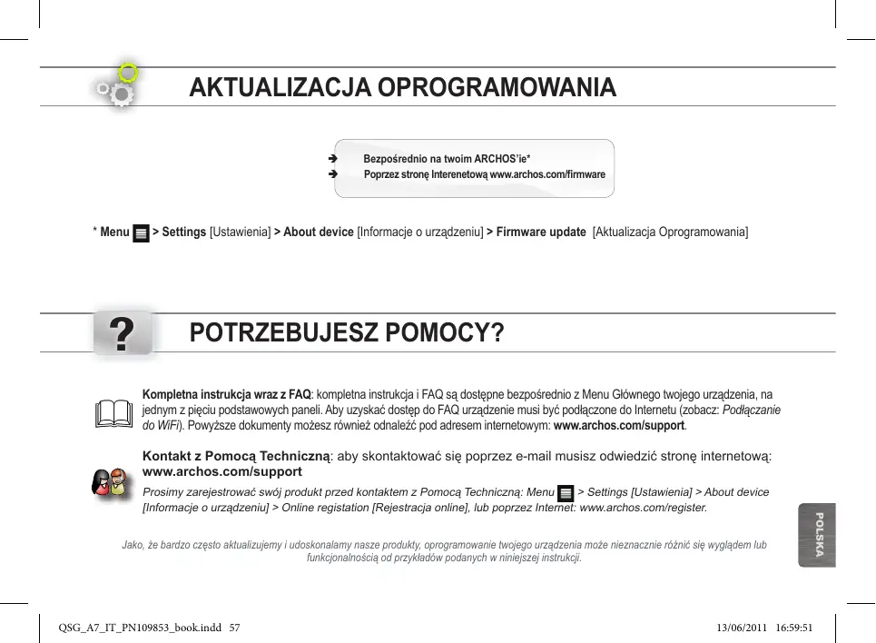 Bezpośrednio na twoim ARCHOS’ie* Poprzez stronę Interenetową www.archos.com/firmware > Settings [Ustawienia] > About device [Informacje o urządzeniu] > Firmware update [Aktualizacja Oprogramowania] POTRZEBUJESZ POMOCY? Kompletna instrukcja wraz z FAQ: kompletna instrukcja i FAQ są dostępne bezpośrednio z Menu Głównego twojego urządzenia, na jednym z pięciu podstawowych paneli. Aby uzyskać dostęp do FAQ urządzenie musi być podłączone do Internetu (zobacz: Podłączanie do WiFi). Powyższe dokumenty możesz również odnaleźć pod adresem internetowym: www.archos.com/support. Kontakt z Pomocą Techniczną: aby skontaktować się poprzez e-mail musisz odwiedzić stronę internetową: www.archos.com/support Jako, że bardzo często aktualizujemy i udoskonalamy nasze produkty, oprogramowanie twojego urządzenia może nieznacznie różnić się wyglądem lub funkcjonalnością od przykładów podanych w niniejszej instrukcji. QSG_A7_IT_PN109853_book.indd 57 13/06/2011 16:59:51 POLSKA Prosimy zarejestrować swój produkt przed kontaktem z Pomocą Techniczną: Menu > Settings [Ustawienia] > About device [Informacje o urządzeniu] > Online registation [Rejestracja online], lub poprzez Internet: www.archos.com/register.