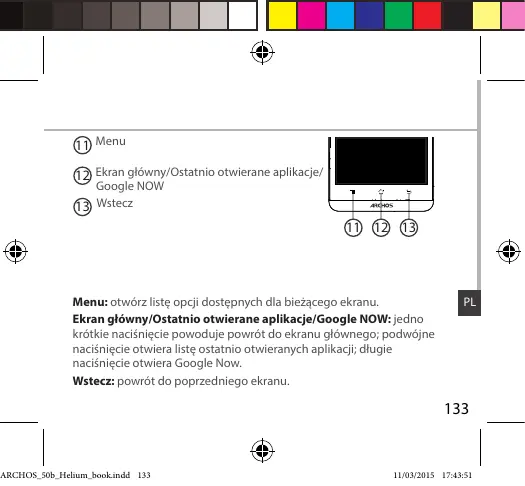 Menu: otwôrz liste opcj dostepnych dla biezacego ekranu PL Ekran gléwny/Ostatnio otwierane aplikacje/Google NOW: jedno krôtkie naciéniecie powoduje powrét do ekranu gléwnego; podwôjne naciénigcie otwiera liste ostatnio otwieranych aplikacj: dlugie naciénigcie otwiera Google Now Wstecz: pourôt do poprzedniego ekranu