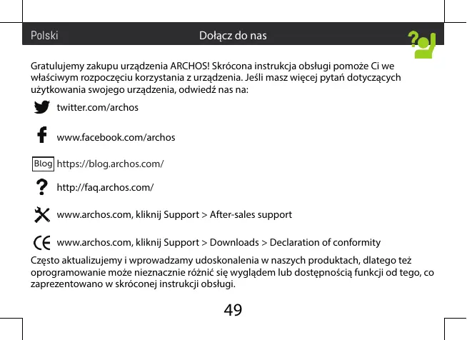 Pobierz instrukcję dla swojego Smartfon w formacie PDF za darmo! Znajdź swoją instrukcję 55 DIAMOND SELFIE, 55 DIAMOND SELFIE LITE - ARCHOS i weź swoje urządzenie elektroniczne z powrotem w ręce. Na tej stronie opublikowane są wszystkie dokumenty niezbędne do korzystania z urządzenia. 55 DIAMOND SELFIE, 55 DIAMOND SELFIE LITE marki ARCHOS.