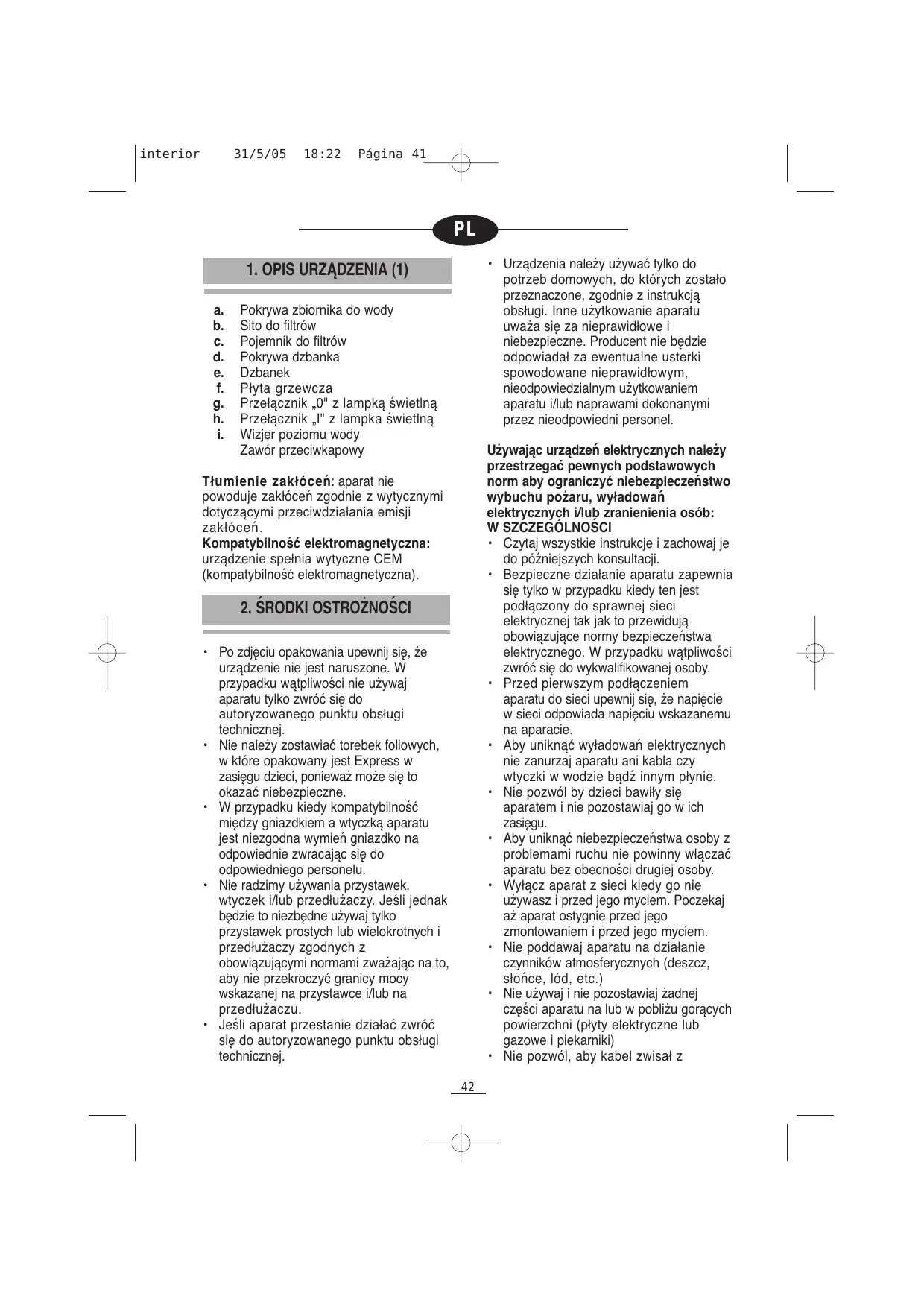 Pokrywa zbiornika do wody Sito do filtrów Pojemnik do filtrów Pokrywa dzbanka Dzbanek Płyta grzewcza Przełącznik „0" z lampką świetlną Przełącznik „I" z lampka świetlną Wizjer poziomu wody Zawór przeciwkapowy Używając urządzeń elektrycznych należy przestrzegać pewnych podstawowych norm aby ograniczyć niebezpieczeństwo wybuchu pożaru, wyładowań elektrycznych i/lub zranienienia osób: