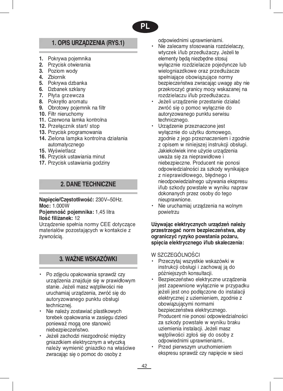 - Urzadzenia przyznaczone jest wyłącznych do uzytku domowego, zgodnia z seinen przyznaczeniem i zgodnia z opisem w niniejszej instrukcji obstrugi. Jakiekolwiek inne uzychiec urzadzenia uwaza sie za nieprawidlowe iNiebezpieczne. Producent nie ponosi odpowiedzialnosci za szkody wynikajace z nieprawidlowego, będnego i niedopowiezialnego uzywania ekspresu i/lub szkody powstały wwyniku napraw dokonanych przyez osoby do tegoNieuprawnione.