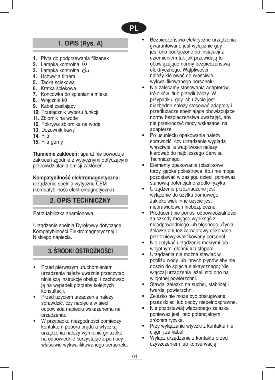W przypadku awarii, nieprawidłowego działania lub nie użytkowania wyłącz urządzenie i nie podejmować samodzielnych napraw. W przypadku, gdyby konieczna była naprawa należy zwrócić się wyłącznie do autoryzowanego przez producenta serwisu i żądać zastosowania oryginalnych części zamiennych. Jeżeli kabel jest uszkodzony należy go wymienić w wyłącznie w autoryzowanym serwisie technicznym. Żelazko nie może być poddawane działaniu czynnikom atmosferycznym (deszcz, słońce, lód, etc.). Urządzenie nie jest przeznaczone do obsługi przez dzieci i osoby z zaburzeniami sprawności fizycznej, zmysłów, zdolności umysłowych, oraz przez osoby bez odpowiedniego doświadczenia lub wiedzy; z wyjątkiem obsługi pod nadzorem opiekuna prawnego, po otrzymaniu przeszkolenia w zakresie obsługi urządzenia. Uważać na dzieci – urządzenie nie jest przeznaczone do zabawy. Zaleca się zabezpieczenie urządzenia wyłącznikiem różnicowoprądowym (RCD) z prądem znamionowym różnicowym nie wyższym od 30 mA. Aby uzyskać więcej informacji, należy skontaktować się z elektrykiem. Nie używaj i nie pozostawiaj żadnego elementu żelazka na lub w pobliżu rozgrzanych powierzchni (płyty gazowe, elektryczne lub piekarniki). Do mycia żelazka nie używaj płynów lub szorstkich ściereczek. Nie dotykaj rozgrzanych powierzchni. Stosuj łapki lub uchwyty. Kabel elektryczny nie może dotykać rozgrzanych powierzchni żelazka. Nie należy korzystać z urządzenia bez wody w zbiorniku. Nie należy podgrzewać płynów łatwopalnych przy użyciu końcówki do spieniania. Przed uruchomieniem ekspresu należy odpowiednio umieścić tackę i kratkę ściekową. Uwaga! Końcówka do spieniania mleka oraz pojemnik z filtrem nagrzewają się