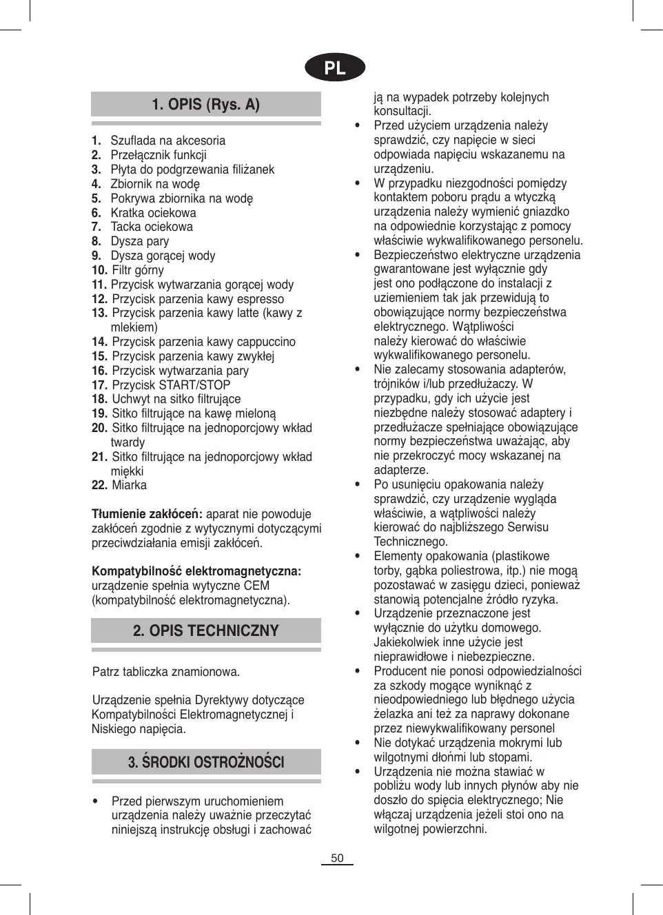 należy umyć wodą z płynem do mycia naczyń filtry (19, 20 i 21), miarkę (22), zbiornik na wodę (4), dyszę gorącej wody (9) i dyszę pary (8), a następnie wszystko starannie wypłukać.