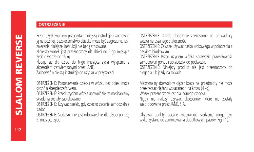 Przed użytkowaniem przeczytać niniejszą instrukcję i zachować ją na później. Bezpieczeństwo dziecka może być zagrożone, jeśli zalecenia niniejszej instrukcji nie będą stosowane. Niniejszy wózek jest przeznaczony dla dzieci od 6-go miesiąca życia o wadze do 15 kg. Nadaje się dla dzieci do 6-go miesiąca życia wyłącznie z akcesoriami zatwierdzonymi przez JANÉ. Zachować niniejszą instrukcję do użytku w przyszłości. OSTRZEŻENIE: Każde obciążenie zawieszone na prowadnicy wózka narusza jego stateczność. OSTRZEŻENIE: Zawsze używać paska krokowego w połączeniu z paskiem biodrowym. OSTRZEŻENIE Przed użyciem wózka sprawdzić prawidłowość zamocowań gondoli ub siedzisk do podwozia. OSTRZEŻENIE: Niniejszy produkt nie jest przeznaczony do biegania lub jazdy na rolkach. OSTRZEŻENIE: Pozostawienie dziecka w wózku bez opieki może grozić niebezpieczeństwem. OSTRZEŻENIE: Przed użyciem wózka upewnić się, że mechanizmy składania zostały zablokowane. OSTRZEŻENIE: Używać szelek, gdy dziecko zacznie samodzielnie siadać. OSTRZEŻENIE: Siedzisko nie jest odpowiednie dla dzieci poniżej