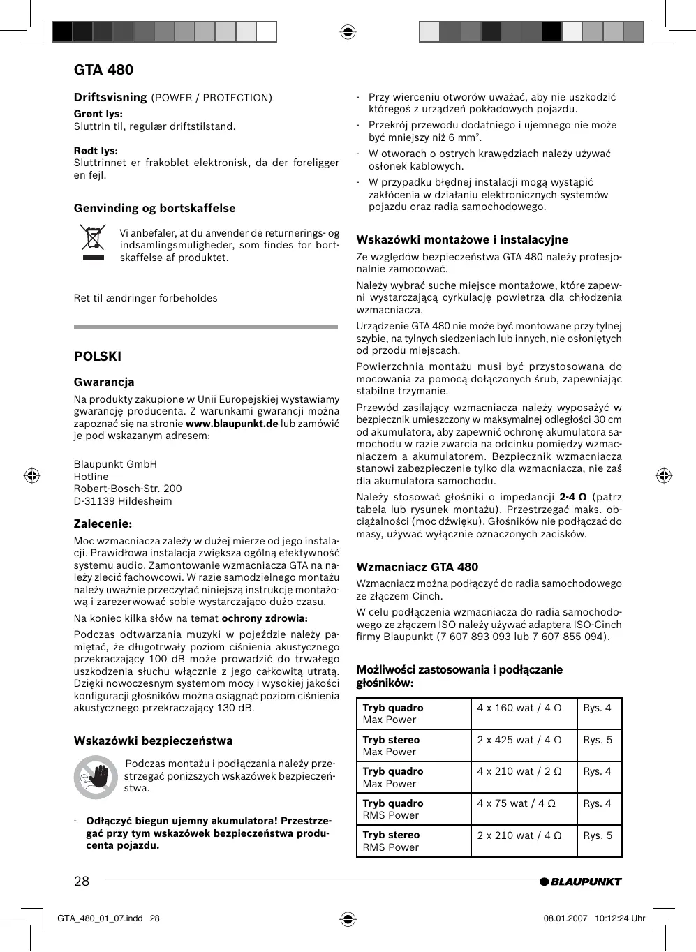 GTA 480 - Wzmacniacz audio BLAUPUNKT - Bezpłatna instrukcja obsługi
