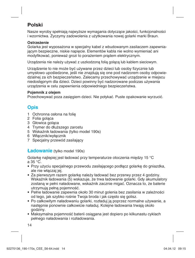Polski Nasze wyroby spełniają najwyższe wymagania dotyczące jakości, funkcjonalności i wzornictwa. Życzymy zadowolenia z użytkowania nowej golarki marki Braun. Ostrzeżenie Golarka jest wyposażona w specjalny kabel z wbudowanym zasilaczem zapewniającym bezpieczne, niskie napięcie. Elementów kabla nie wolno wymieniać ani modyfikować, ponieważ grozi to porażeniem prądem elektrycznym. Urządzenia nie należy używać z uszkodzoną folią golącą lub kablem sieciowym. Urzàdzenie to nie mo˝e byç u˝ywane przez dzieci lub osoby fizycznie lub umys∏owo upoÊledzone, jeÊli nie znajdujà si´ one pod nadzorem osoby odpowiedzialnej za ich bezpieczeƒstwo. Zalecamy przechowywaç urzàdzenie w miejscu niedost´pnym dla dzieci. Dzieci powinny być nadzorowane podczas używania urządzenia w celu zapewnienia odpowiedniego bezpieczeństwa. Pojemnik z olejem Przechowywać poza zasięgiem dzieci. Nie połykać. Puste opakowanie wyrzucić. Opis