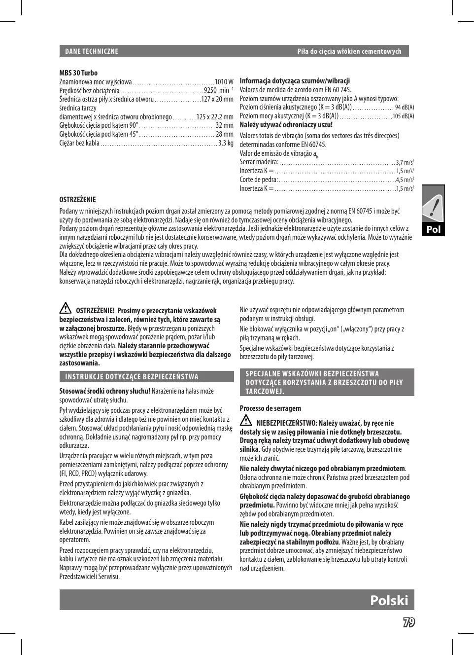 DANE TECHNICZNE Pita do ciecia wlékien cementowych MBS 30 Turbo Inamionowa oc wyjéciowa 1010W Predkoÿé bez obcgéenia 9250 min * Srednica ostrza pily x érednica otworu ..127x20mm $rednica tarczy 125x22,2mm 32mm 28mm 33kg diamentowej x érednica otworu obrobionego Glebako$é ceci pod katem 90°. Glebako$éceda pod katem 45°. Ggzar bezkabla OSTRZEZENIE Podany w ninieszych instrukcjach poziom drgazostat zmierzony za pomoca metody pomiarowej 2godnej z norma EN 60745 moe byé uiyty do poréwnania ze soba elektronarzedai. Nadaje sig on réwnie do tymczasowej oceny obcigéenia wibracyjnego. Podany poziom drgañ reprezentuje gléwne zastosowana elektronarzedzia.Jelijednakce elektronarzedzie uèyte zostanie do innych celôwrz Informagja dotyczaca szumôw/wibragji Valors de medida de acordo com EN 60 745. Poziom szuméw urzadenia oszacowany jako À wynositypovo: Poziom cinienia akustycznego (K = 3 dB(A)) 94 dB(A) Poziom mocy akustycznej (K = 3 dB{A)) 105 dB(A) Naleiy uiywaé ochroniaay uszu! Valoestotais de vibraçéo {soma dos vectoes ds très direcçôes) determinadas conforme EN 60745. Valor de emissäo de vibraçäo a, Serrar madeira: 37m Incerteza K =... 15m Corte de pedra: 45m IncertezaK =. 15m LL] innym narzediami roboczymi lu nie est dostatecanie konsenwowane, wedy poziom drgañ moe wykazywac odchylenia, Moie to wyraénie wikszyé obdigéenie wibragjami przez cb okres pra. Dia dokladnego okreslenia obcazenia wibragjaminaley uwzglednié réwmieé czasy,w ktérych urzadzenie jestwytczone wzgledniejest wlggone, lea w rzecywistoéd ni pracuje. Moëe to spowodowaé wyraéna reduke abcigéenia wibracyjnego w cab okresie pracy. Naleëy wprowadzié dodatkowe érodki zapobiegawcze celem ochrony obstugujacego przed oddziahpwaniem drgar,jakna przyklad: Konserwacja narzgdai roboczych ielektronarzedai, nagrzanie ak, organizaga przcbiegu pra}. VAN OSTRZEZENIE! Prosimy o przeczytanie wskazéwek bezpieczerstwa i zaleceñ, réwniei tych, ktôre zawarte sa wzalaaonej broszurze. Bledy w przestrzeganiu poniés2ych vskazôwek moga spovodowaé porazenie pradem, pozar /lub cigéke obrazenia cal. Nalleiy starannie przechowywaé wszystkie przepisy i wskazéwki bezpieczerstwa dla dalszego zastosowania.