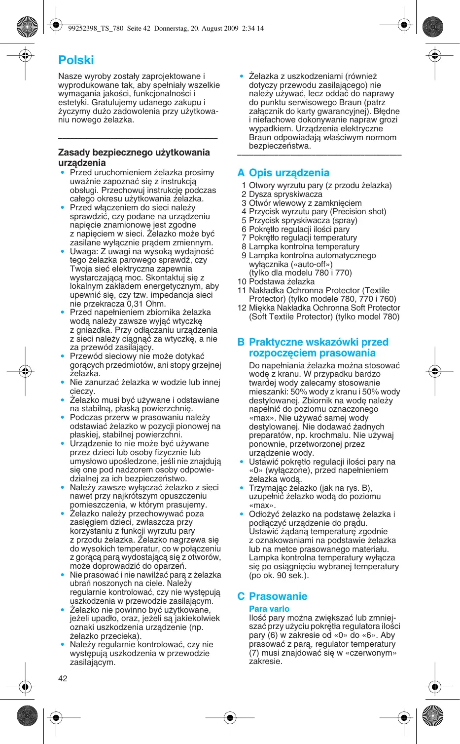 Želazka z uszkodzeniami (rònwnież dotyczny przywymi, lecz odść do naprawy do punktu serwisowej Braun (patrz załącznik do karty gwarancynej). Będne i niefachowe dokonywanie napraw grozi wypadkiem. Urzadzenia elektryczne Braun odpopowiada sąsciwym normom bezpieczność.