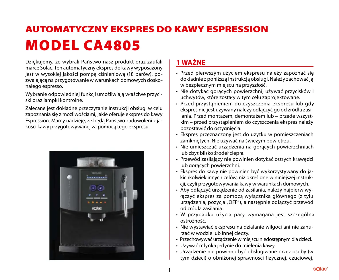 MODEL CA4805 1 WAŻNE Dziękujemy, że wybrali Państwo nasz produkt oraz zaufali marce Solac. Ten automatyczny ekspres do kawy wyposażony jest w wysokiej jakości pompę ciśnieniową (18 barów), pozwalającą na przygotowanie w warunkach domowych doskonałego espresso. Wybranie odpowiedniej funkcji umożliwiają właściwe przyciski oraz lampki kontrolne. Zalecane jest dokładne przeczytanie instrukcji obsługi w celu zapoznania się z możliwościami, jakie oferuje ekspres do kawy Espression. Mamy nadzieję, że będą Państwo zadowoleni z jakości kawy przygotowywanej za pomocą tego ekspresu.