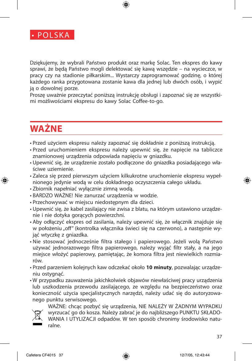 Cafetera CF4015 37 12/7/05, 12:43:44 UŻYTKOWAĆ ZGODNIE Z PRZEZNACZENIEM! Urządzenie to może być stosowane wyłącznie do przyrządzania kawy w domu. Nie wolno napełniać zbiornika mlekiem, zupą, kawą rozpuszczalną ani herbatą. Używać wyłącznie kawy mielonej. Firma nie ponosi odpowiedzialności za straty spowodowane używaniem ekspresu niezgodnie z jego przeznaczeniem, niewłaściwą eksploatacją lub naprawą urządzenia przez niewykwalifikowane osoby. Wymienione przypadki nie są objęte gwarancją.