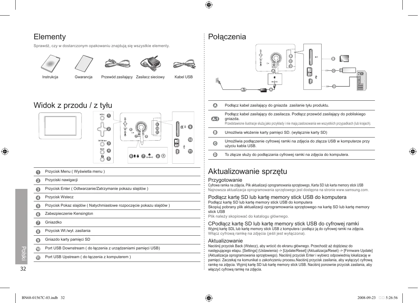 Podłącz kabel zasilający do zasilacza. Podłącz przewód zasilający do pobliskiego gniazda. Przedstawione ilustracje służą jako przykłady i nie mają zastosowania we wszystkich przypadkach (lub krajach). Umożliwia podłączenie cyfrowej ramki na zdjęcia do złącza USB w komputerze przy użyciu kabla USB. To złącze służy do podłączania cyfrowej ramki na zdjęcia do komputera. Przycisk Menu ( Wyświetla menu ) Aktualizowanie sprzętu Przyciski nawigacji Przygotowanie Przycisk Enter ( Odtwarzanie/Zatrzymanie pokazu slajdów ) Cyfrowa ramka na zdjęcia, Plik aktualizacji oprogramowania sprzętowego, Karta SD lub karta memory stick USB Najnowsza aktualizacja oprogramowania sprzętowego jest dostępna na stronie www.samsung.com. Przycisk Wstecz Podłącz kartę SD lub kartę memory stick USB do komputera Przycisk Pokaz slajdów ( Natychmiastowe rozpoczęcie pokazu slajdów ) Zabezpieczenie Kensington Gniazdko Podłącz kartę SD lub kartę memory stick USB do komputera Skopiuj pobrany plik aktualizacji oprogramowania sprzętowego na kartę SD lub kartę memory stick USB Plik należy skopiować do katalogu głównego. CPodłącz kartę SD lub kartę memory stick USB do cyfrowej ramki Przycisk Wł./wył. zasilania Wyjmij kartę SDL lub kartę memory stick USB z komputera i podłącz ją do cyfrowej ramki na zdjęcia. Włącz cyfrową ramkę na zdjęcia (jeśli jest wyłączona). Gniazdo karty pamięci SD Aktualizowanie Polski Port USB Downstream ( do łączenia z urządzeniami pamięci USB) Port USB Upstream ( do łączenia z komputerem )