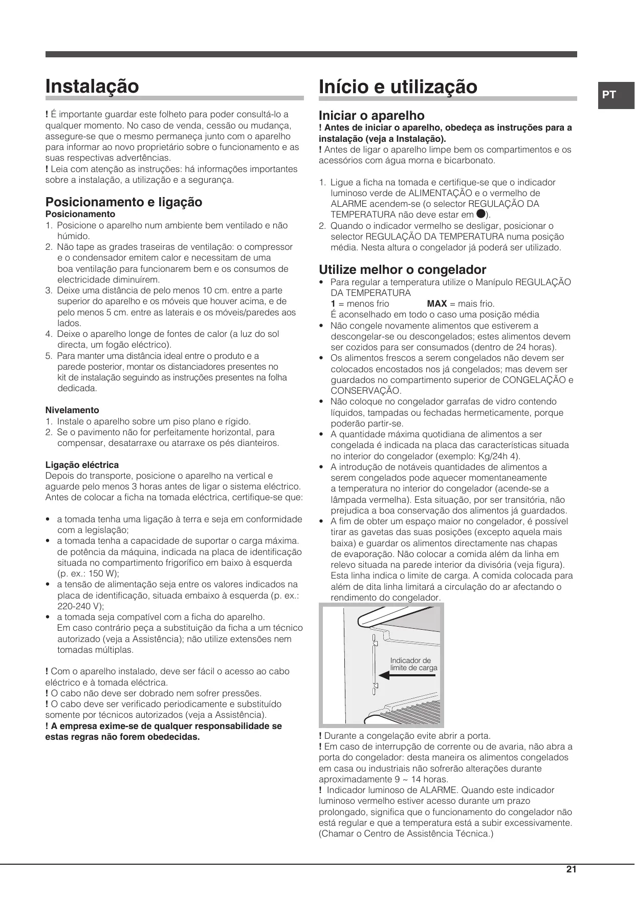 • Para regular a temperatura utilize o Manípulo REGULAÇÃO DA TEMPERATURA 1 = menos frio MAX = mais frio. É aconselhado em todo o caso uma posição média • Não congele novamente alimentos que estiverem a descongelar-se ou descongelados; estes alimentos devem ser cozidos para ser consumados (dentro de 24 horas). • Os alimentos frescos a serem congelados não devem ser colocados encostados nos já congelados; mas devem ser guardados no compartimento superior de CONGELAÇÃO e CONSERVAÇÃO. • Não coloque no congelador garrafas de vidro contendo líquidos, tampadas ou fechadas hermeticamente, porque poderão partir-se. • A quantidade máxima quotidiana de alimentos a ser congelada é indicada na placa das características situada no interior do congelador (exemplo: Kg/24h 4). • A introdução de notáveis quantidades de alimentos a serem congelados pode aquecer momentaneamente a temperatura no interior do congelador (acende-se a lâmpada vermelha). Esta situação, por ser transitória, não prejudica a boa conservação dos alimentos já guardados. • A fim de obter um espaço maior no congelador, é possível tirar as gavetas das suas posições (excepto aquela mais baixa) e guardar os alimentos directamente nas chapas de evaporação. Não colocar a comida além da linha em relevo situada na parede interior da divisória (veja figura). Esta linha indica o limite de carga. A comida colocada para além de dita linha limitará a circulação do ar afectando o rendimento do congelador.