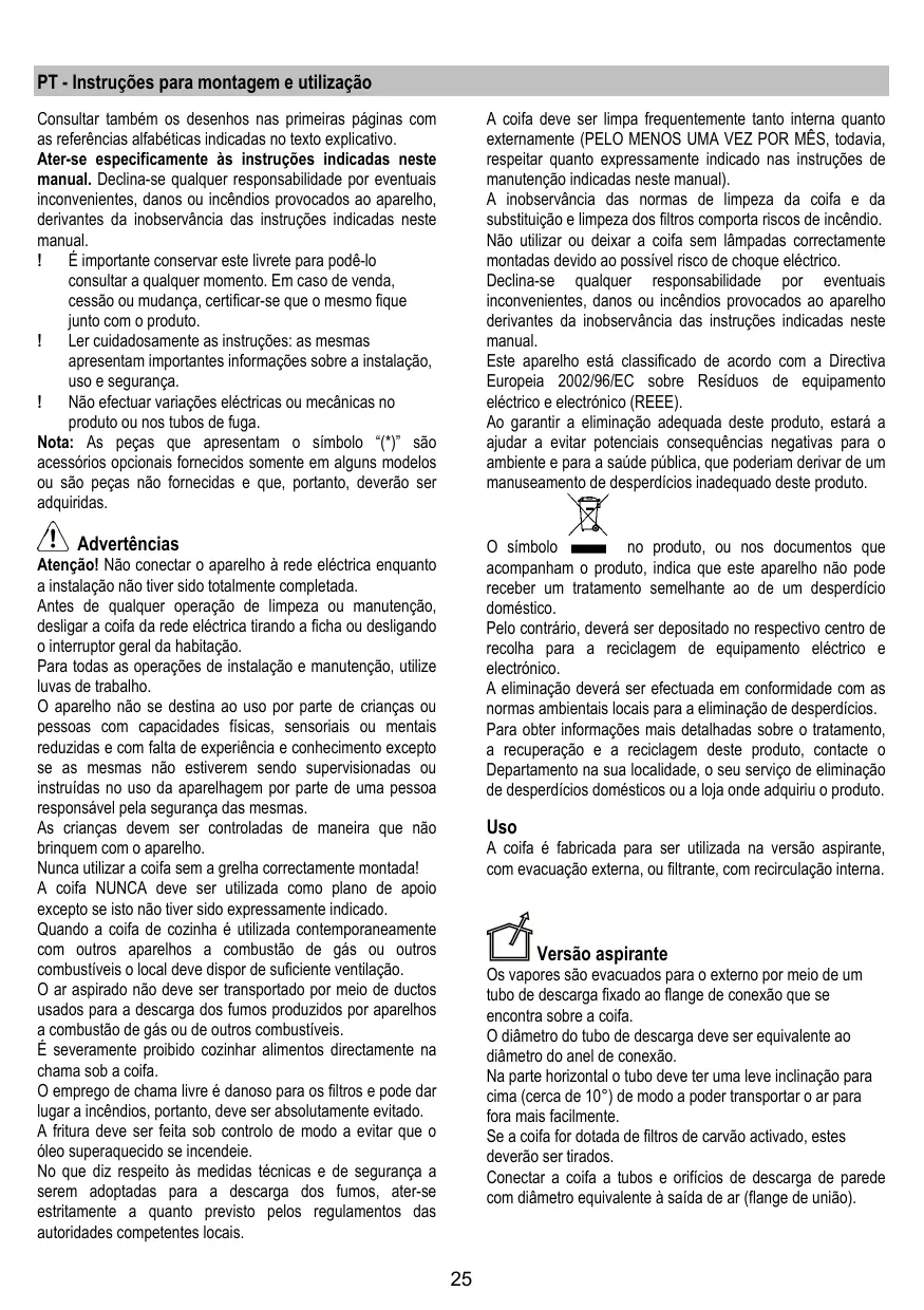 A coifa deve ser limpa frequentemente tanto interna quanto externamente (PELO MENOS UMA VEZ POR MÊS, todavia, respeitar quanto expressamente indicado nas instruções de manutenção indicadas neste manual). A inobservância das normas de limpeza da coifa e da substituição e limpeza dos filtros comporta riscos de incêndio. Não utilizar ou deixar a coifa sem lâmpadas correctamente montadas devido ao possível risco de choque eléctrico. Declina-se qualquer responsabilidade por eventuais inconvenientes, danos ou incêndios provocados ao aparelho derivantes da inobservância das instruções indicadas neste manual. Este aparelho está classificado de acordo com a Directiva Europeia 2002/96/EC sobre Resíduos de equipamento eléctrico e electrónico (REEE). Ao garantir a eliminação adequada deste produto, estará a ajudar a evitar potenciais consequências negativas para o ambiente e para a saúde pública, que poderiam derivar de um manuseamento de desperdícios inadequado deste produto.