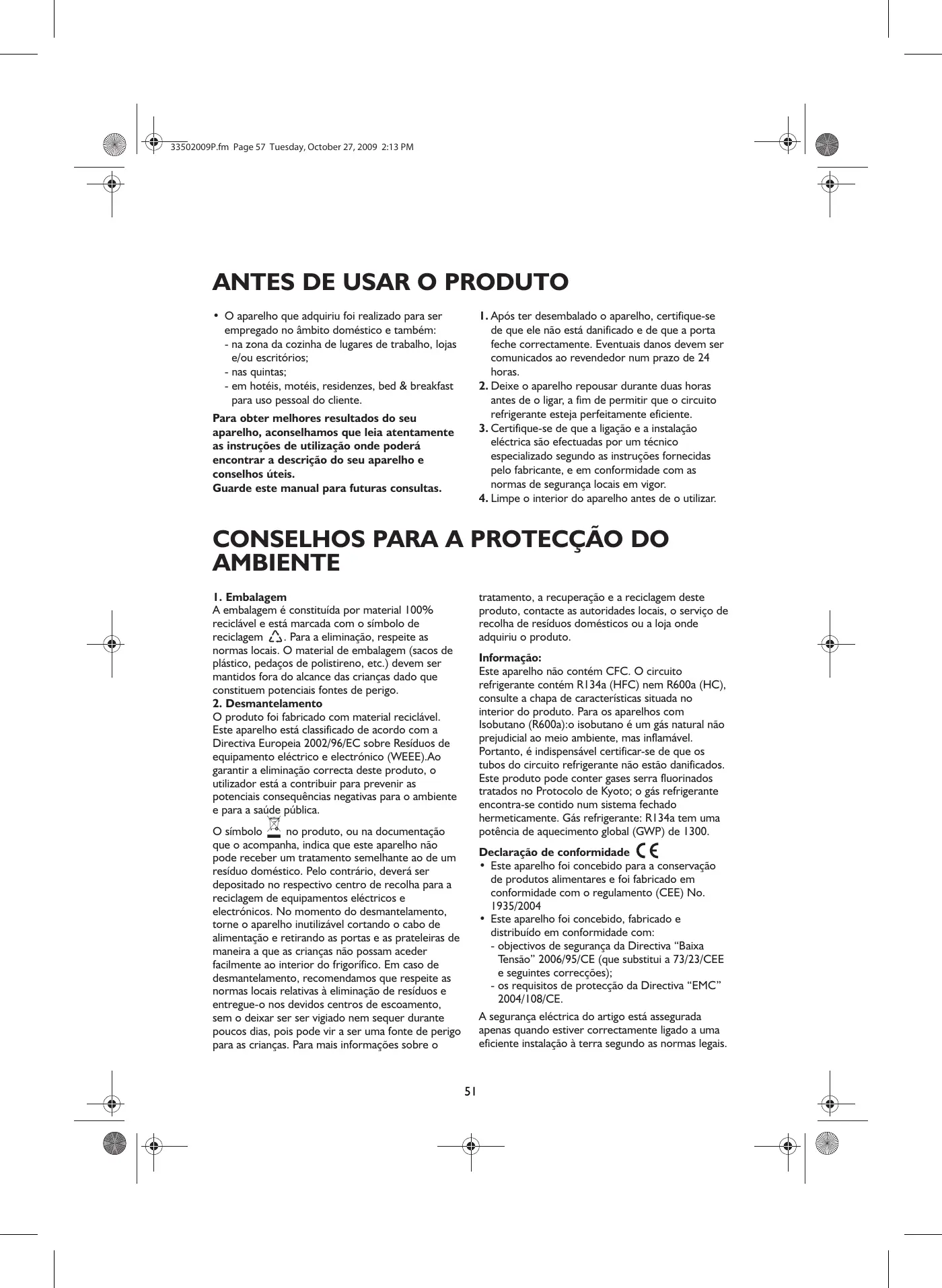 O produto foi fabricado com material reciclável. Este aparelho está classificado de acordo com a Directiva Europeia 2002/96/EC sobre Resíduos de equipamento eléctrico e electrónico (WEEE).Ao garantir a eliminação correcta deste produto, o utilizador está a contribuir para prevenir as potenciais consequências negativas para o ambiente e para a saúde pública. tratamento, a recuperação e a reciclagem deste produto, contacte as autoridades locais, o serviço de recolha de resíduos domésticos ou a loja onde adquiriu o produto. Informação: Este aparelho não contém CFC. O circuito refrigerante contém R134a (HFC) nem R600a (HC), consulte a chapa de características situada no interior do produto. Para os aparelhos com Isobutano (R600a):o isobutano é um gás natural não prejudicial ao meio ambiente, mas inflamável. Portanto, é indispensável certificar-se de que os tubos do circuito refrigerante não estão danificados. Este produto pode conter gases serra fluorinados tratados no Protocolo de Kyoto; o gás refrigerante encontra-se contido num sistema fechado hermeticamente. Gás refrigerante: R134a tem uma potência de aquecimento global (GWP) de 1300. O símbolo no produto, ou na documentação que o acompanha, indica que este aparelho não pode receber um tratamento semelhante ao de um resíduo doméstico. Pelo contrário, deverá ser depositado no respectivo centro de recolha para a reciclagem de equipamentos eléctricos e electrónicos. No momento do desmantelamento, torne o aparelho inutilizável cortando o cabo de alimentação e retirando as portas e as prateleiras de maneira a que as crianças não possam aceder facilmente ao interior do frigorífico. Em caso de desmantelamento, recomendamos que respeite as normas locais relativas à eliminação de resíduos e entregue-o nos devidos centros de escoamento, sem o deixar ser ser vigiado nem sequer durante poucos dias, pois pode vir a ser uma fonte de perigo para as crianças. Para mais informações sobre o Declaração de conformidade