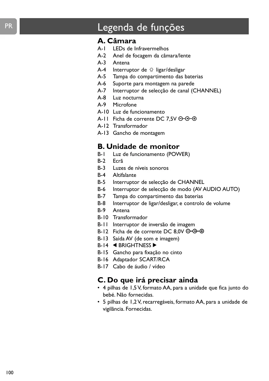 C. Do que irá precisar ainda • 4 pilhas de 1,5 V, formato AA, para a unidade que fica junto do bebé. Não fornecidas. • 5 pilhas de 1,2 V, recarregáveis, formato AA, para a unidade de vigilância. Fornecidas.