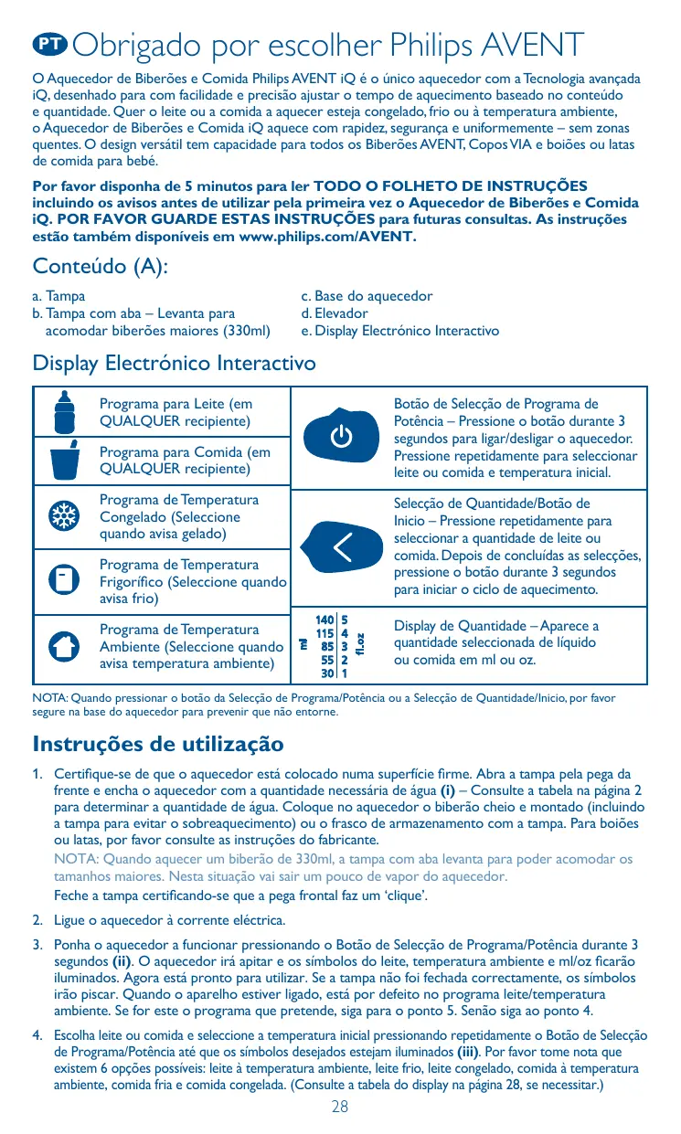Obrigado por escolher Philips AVENT O Aquecedor de Biberões e Comida Philips AVENT iQ é o único aquecedor com a Tecnologia avançada iQ, desenhado para com facilidade e precisão ajustar o tempo de aquecimento baseado no conteúdo e quantidade. Quer o leite ou a comida a aquecer esteja congelado, frio ou à temperatura ambiente, o Aquecedor de Biberões e Comida iQ aquece com rapidez, segurança e uniformemente – sem zonas quentes. O design versátil tem capacidade para todos os Biberões AVENT, Copos VIA e boiões ou latas de comida para bebé. Por favor disponha de 5 minutos para ler TODO O FOLHETO DE INSTRUÇÕES incluindo os avisos antes de utilizar pela primeira vez o Aquecedor de Biberões e Comida iQ. POR FAVOR GUARDE ESTAS INSTRUÇÕES para futuras consultas. As instruções estão também disponíveis em www.philips.com/AVENT. Conteúdo (A): a. Tampa b. Tampa com aba – Levanta para acomodar biberões maiores (330ml) c. Base do aquecedor d. Elevador e. Display Electrónico Interactivo Display Electrónico Interactivo Programa para Leite (em QUALQUER recipiente) Botão de Selecção de Programa de Potência – Pressione o botão durante 3 segundos para ligar/desligar o aquecedor. Pressione repetidamente para seleccionar leite ou comida e temperatura inicial. Programa para Comida (em QUALQUER recipiente) Programa de Temperatura Ambiente (Seleccione quando avisa temperatura ambiente)