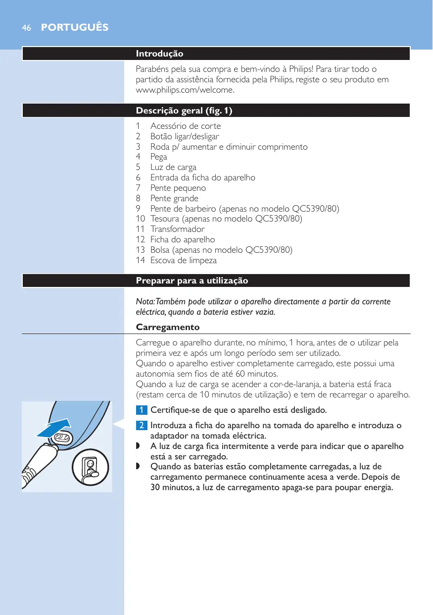 Acessório de corte Botão ligar/desligar Roda p/ aumentar e diminuir comprimento Pega Luz de carga Entrada da ficha do aparelho Pente pequeno Pente grande Pente de barbeiro (apenas no modelo QC5390/80) Tesoura (apenas no modelo QC5390/80) Transformador Ficha do aparelho Bolsa (apenas no modelo QC5390/80) Escova de limpeza Preparar para a utilização Nota:Também pode utilizar o aparelho directamente a partir da corrente eléctrica, quando a bateria estiver vazia. Carregamento Carregue o aparelho durante, no mínimo, 1 hora, antes de o utilizar pela primeira vez e após um longo período sem ser utilizado. Quando o aparelho estiver completamente carregado, este possui uma autonomia sem fios de até 60 minutos. Quando a luz de carga se acender a cor-de-laranja, a bateria está fraca (restam cerca de 10 minutos de utilização) e tem de recarregar o aparelho. 1 Certifique-se de que o aparelho está desligado. 2 Introduza a ficha do aparelho na tomada do aparelho e introduza o adaptador na tomada eléctrica. ,, A luz de carga fica intermitente a verde para indicar que o aparelho está a ser carregado. ,, Quando as baterias estão completamente carregadas, a luz de carregamento permanece continuamente acesa a verde. Depois de 30 minutos, a luz de carregamento apaga-se para poupar energia. Português