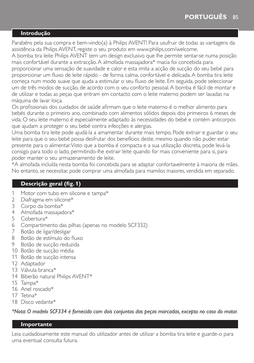 Motor com tubo em silicone e tampa* Diafragma em silicone* Corpo da bomba* Almofada massajadora* Cobertura* Compartimento das pilhas (apenas no modelo SCF332) Botão de ligar/desligar Botão de estímulo do fluxo Botão de sucção reduzida Botão de sucção média Botão de sucção intensa Adaptador Válvula branca* Biberão natural Philips AVENT* Tampa* Anel roscado* Tetina* Disco vedante* *Nota: O modelo SCF334 é fornecido com dois conjuntos das peças marcadas, excepto no caso do motor. Importante Leia cuidadosamente este manual do utilizador antes de utilizar a bomba tira leite e guarde-o para uma eventual consulta futura.