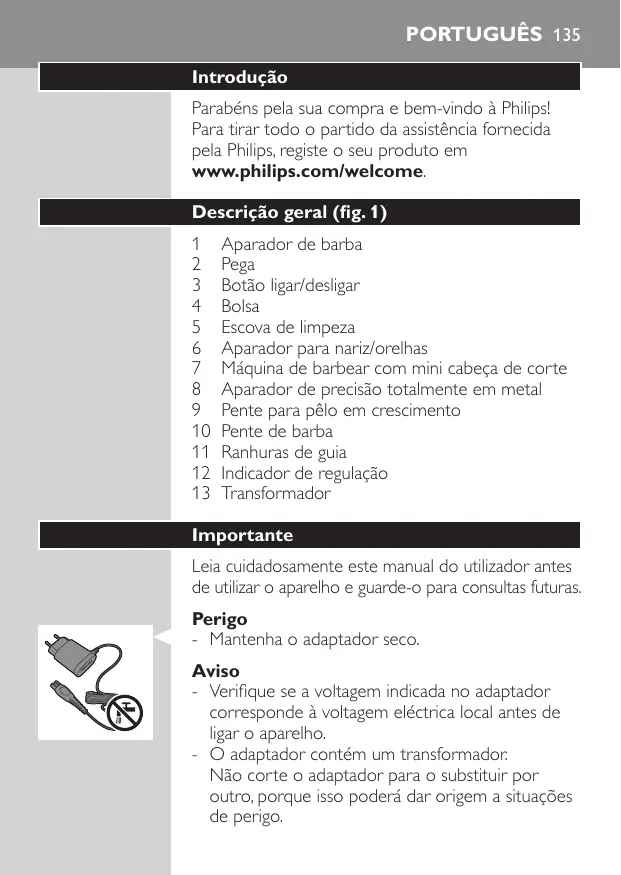 Aparador de barba Pega Botão ligar/desligar Bolsa Escova de limpeza Aparador para nariz/orelhas Máquina de barbear com mini cabeça de corte Aparador de precisão totalmente em metal Pente para pêlo em crescimento Pente de barba Ranhuras de guia Indicador de regulação Transformador Importante Leia cuidadosamente este manual do utilizador antes de utilizar o aparelho e guarde-o para consultas futuras. Perigo -- Mantenha o adaptador seco. Aviso -- Verifique se a voltagem indicada no adaptador corresponde à voltagem eléctrica local antes de ligar o aparelho. -- O adaptador contém um transformador. Não corte o adaptador para o substituir por outro, porque isso poderá dar origem a situações de perigo. 136 Português -- Este aparelho não se destina a ser utilizado por pessoas (incluindo crianças) com capacidades físicas, sensoriais ou mentais reduzidas, ou com falta de experiência e conhecimentos, salvo se tiverem recebido supervisão ou instruções sobre o uso do aparelho por alguém responsável pela sua segurança. -- Este aparelho não deve ser utilizado por crianças. As crianças devem ser vigiadas para assegurar que não brincam com o aparelho. -- Verifique sempre o aparelho antes de o utilizar. Não utilize o aparelho caso este esteja danificado, pois isto pode causar ferimentos. -- Não utilize o aparelho no banho ou no duche. Cuidado -- Utilize apenas o adaptador fornecido. -- Utilize, carregue e guarde o aparelho a uma temperatura entre 5 °C e 35 °C. -- Certifique-se de que desligou o aparelho e retirou a ficha da tomada eléctrica antes de o lavar em água corrente. -- Se o adaptador se danificar, este deverá ser substituído apenas por uma peça de origem para evitar situações de perigo. -- Se o aparelho for sujeito a uma mudança significativa de temperatura, pressão ou humidade, deixe o aparelho ambientar-se durante 30 minutos antes de o utilizar. -- Não utilize o aparelho se alguma das suas peças estiver danificada ou partida para evitar magoar-se. -- Nunca utilize ar comprimido, esfregões, agentes de limpeza abrasivos ou líquidos agressivos, tais como petróleo ou acetona, para limpar o aparelho. -- Nível máximo de ruído: Lc = 75 dB(A) Português 137 Conformidade com as normas -- Este aparelho está em conformidade com as regulamentações de segurança CEI aprovadas internacionalmente e pode ser lavado em água corrente com total segurança. -- Este aparelho da Philips respeita todas as normas relacionadas com campos electromagnéticos (CEM). Se for manuseado correctamente e de acordo com as instruções neste manual do utilizador, este aparelho proporciona uma utilização segura, como demonstrado pelas provas científicas actualmente disponíveis. Carregamento O carregamento normal demora aproximadamente 10 horas. Quando o aparelho estiver completamente carregado, este tem uma autonomia de até 35 minutos. Nota: Pode obter 45 minutos de autonomia sem fios, se o aparelho for carregado à noite durante 16 horas. 1 Desligue o aparelho antes de o carregar. 2 Introduza a ficha do aparelho no aparelho. 3 Ligue o adaptador à tomada eléctrica. ,, A luz de carga do adaptador liga para indicar que o aparelho está a carregar. Nota: A luz de carga não muda de cor nem se apaga quando o aparelho está completamente carregado. 138 Português Utilizar o aparelho Aparar barba normal e curta Se estiver a aparar a barba pela primeira vez, tenha cuidado. Não movimente o aparador muito depressa. Faça movimentos suaves e leves. Aparar a barba com o pente da barba 1 Coloque o aparador na pega (1). Rode o aparador para a direita para o fixar (2). 2 Faça deslizar o pente da barba pelas ranhuras de guia de ambos os lados da pega. 3 Prima o selector de regulação (1) e deslize o pente para a regulação do comprimento pretendido do pêlo (2). Pode escolher qualquer regulação entre 1 e 18 mm. 4 Ligue o aparelho. 5 Movimente o aparador lentamente na direcção oposta ao crescimento do pêlo. Exerça um pouco de pressão e assegure-se sempre de que a superfície do pente está totalmente em contacto com a pele. Nota: Quando aparar pela primeira vez, comece pela regulação mais elevada (18 mm) para se familiarizar com o aparelho. Português 139 Aparar barba curta Pode utilizar o pente para pêlos curtos para aparar uma barba curta. 1 Coloque o aparador na pega (1). Rode o aparador para a direita para o fixar (2). 2 Faça deslizar o pente para pêlos curtos pelas ranhuras de guia de ambos os lados da pega. 3 Prima o selector de regulação (1) e deslize o pente para a regulação do comprimento pretendido do pêlo (2). Pode escolher qualquer regulação entre 1 e 12 mm. 4 Ligue o aparelho. 5 Movimente o aparador lentamente na direcção oposta à do crescimento do pêlo. Exerça um pouco de pressão e assegure-se sempre de que a superfície do pente está totalmente em contacto com a pele. Definir/contornar a sua barba Pode utilizar o aparador de precisão para dar forma ou criar contornos na sua barba. Os pêlos são cortados muito rentes à pele, a um comprimento de 1 mm. Atenção: Tenha cuidado ao utilizar o aparador de precisão, visto que este corta cada pêlo em que toca. 140 Português 1 Coloque o aparador de precisão na pega (1). Rode o aparador de precisão para a direita para o fixar (2). 2 Para obter um bom resultado de corte, movimente o aparador de precisão na direcção oposta ao crescimento do pêlo. Assegure-se sempre de que o aparador de precisão está totalmente em contacto com a pele. 3 Efectue movimentos cuidadosos e controlados com o aparador de precisão. Sugestão: Para o acabamento perfeito, pode utilizar a máquina de barbear com mini cabeça de corte para delinear os limites e as linhas do seu estilo de barba com ainda mais suavidade. Aparar pêlos do nariz e das orelhas Aparar os pêlos do nariz 1 Coloque o aparador para nariz/orelhas na pega (1). Rode o aparador para nariz/orelhas para a direita para o fixar (2). 2 Certifique-se de q