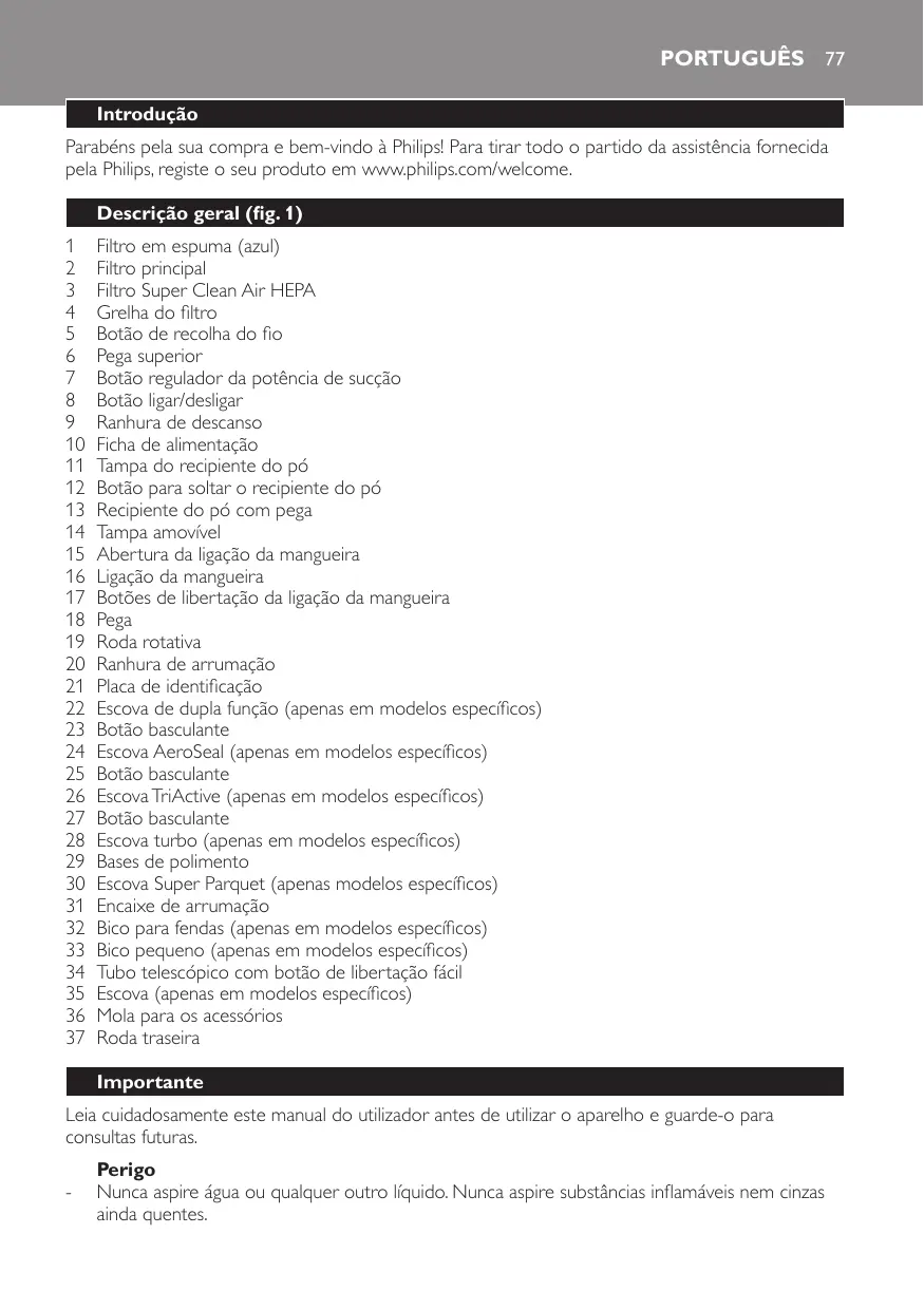 Leia cuidadosamente este manual do utilizador antes de utilizar o aparelho e guarde-o para consultas futuras. Perigo -- Nunca aspire água ou qualquer outro líquido. Nunca aspire substâncias inflamáveis nem cinzas ainda quentes.