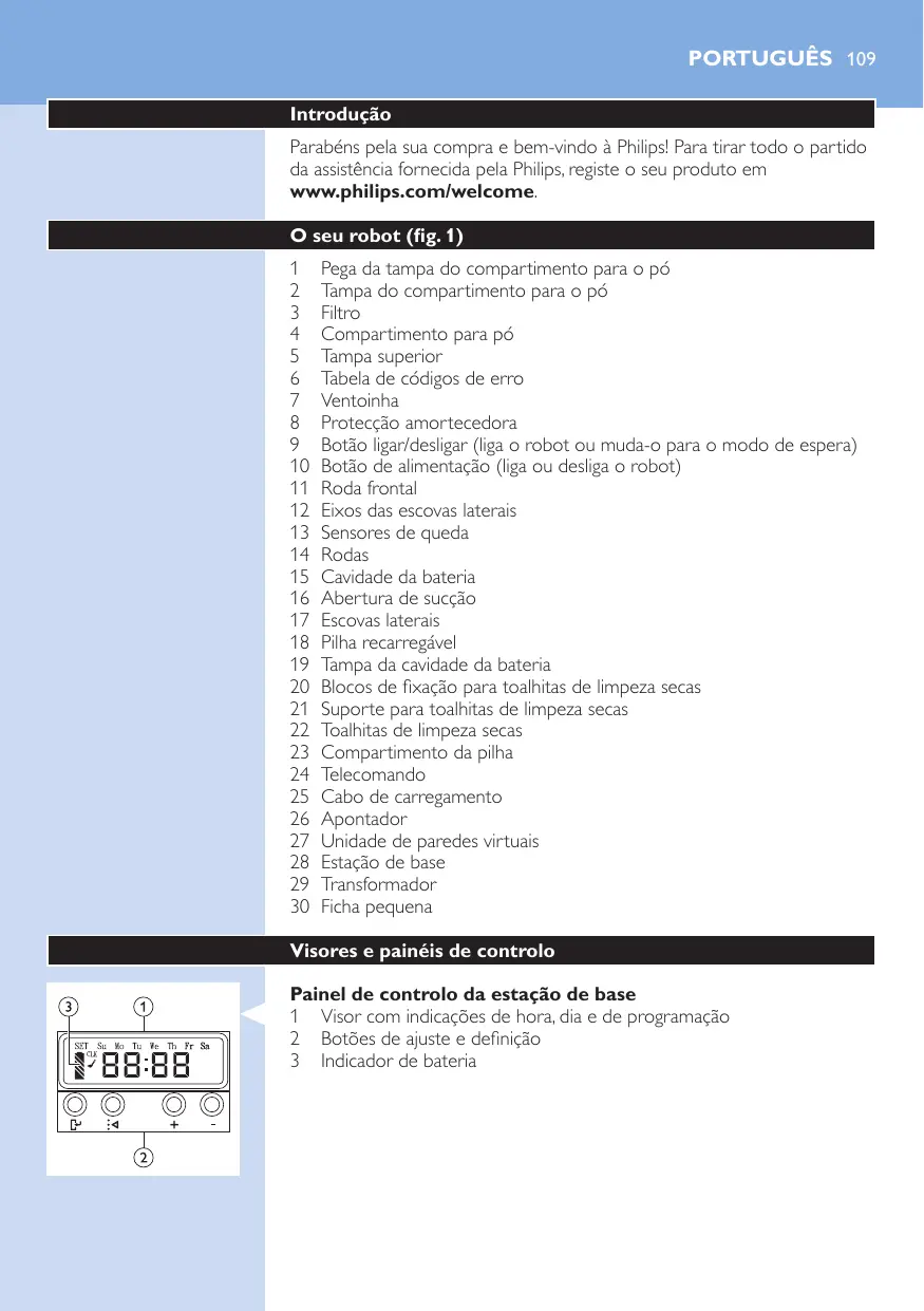 Pega da tampa do compartimento para o pó Tampa do compartimento para o pó Filtro Compartimento para pó Tampa superior Tabela de códigos de erro Ventoinha Protecção amortecedora Botão ligar/desligar (liga o robot ou muda-o para o modo de espera) Botão de alimentação (liga ou desliga o robot) Roda frontal Eixos das escovas laterais Sensores de queda Rodas Cavidade da bateria Abertura de sucção Escovas laterais Pilha recarregável Tampa da cavidade da bateria Blocos de fixação para toalhitas de limpeza secas Suporte para toalhitas de limpeza secas Toalhitas de limpeza secas Compartimento da pilha Telecomando Cabo de carregamento Apontador Unidade de paredes virtuais Estação de base Transformador Ficha pequena Visores e painéis de controlo Painel de controlo da estação de base 1 Visor com indicações de hora, dia e de programação 2 Botões de ajuste e definição 3 Indicador de bateria