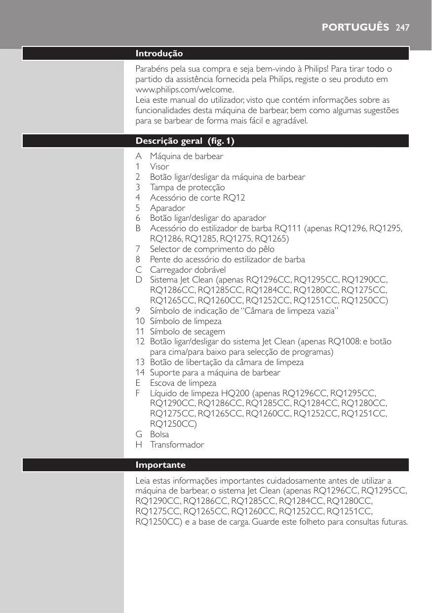 Máquina de barbear Visor Botão ligar/desligar da máquina de barbear Tampa de protecção Acessório de corte RQ12 Aparador Botão ligar/desligar do aparador Acessório do estilizador de barba RQ111 (apenas RQ1296, RQ1295, RQ1286, RQ1285, RQ1275, RQ1265) Selector de comprimento do pêlo Pente do acessório do estilizador de barba Carregador dobrável Sistema Jet Clean (apenas RQ1296CC, RQ1295CC, RQ1290CC, RQ1286CC, RQ1285CC, RQ1284CC, RQ1280CC, RQ1275CC, RQ1265CC, RQ1260CC, RQ1252CC, RQ1251CC, RQ1250CC) Símbolo de indicação de “Câmara de limpeza vazia” Símbolo de limpeza Símbolo de secagem Botão ligar/desligar do sistema Jet Clean (apenas RQ1008: e botão para cima/para baixo para selecção de programas) Botão de libertação da câmara de limpeza Suporte para a máquina de barbear Escova de limpeza Líquido de limpeza HQ200 (apenas RQ1296CC, RQ1295CC, RQ1290CC, RQ1286CC, RQ1285CC, RQ1284CC, RQ1280CC, RQ1275CC, RQ1265CC, RQ1260CC, RQ1252CC, RQ1251CC, RQ1250CC) Bolsa Transformador Importante Leia estas informações importantes cuidadosamente antes de utilizar a máquina de barbear, o sistema Jet Clean (apenas RQ1296CC, RQ1295CC, RQ1290CC, RQ1286CC, RQ1285CC, RQ1284CC, RQ1280CC, RQ1275CC, RQ1265CC, RQ1260CC, RQ1252CC, RQ1251CC, RQ1250CC) e a base de carga. Guarde este folheto para consultas futuras. 248 PORTUGUÊS Perigo -- Mantenha o adaptador seco. Aviso -- O adaptador contém um transformador. Não corte o adaptador para o substituir por outro, porque isso poderá dar origem a situações de perigo. -- A máquina de barbear, o sistema Jet Clean e a base de carga não devem ser utilizados por pessoas (incluindo crianças) com capacidades físicas, sensoriais ou mentais reduzidas, ou com falta de experiência e conhecimento, a não ser que sejam supervisionadas ou recebam instruções relativas à utilização destes aparelhos por uma pessoa responsável pela sua segurança. -- As crianças devem ser vigiadas para garantir que não brincam com a máquina de barbear, o sistema Jet Clean e a base de carga. -- Antes de lavar em água corrente, desligue sempre a máquina de barbear da corrente. Cuidado -- Nunca imerja o sistema Jet Clean ou a base de carga em água, nem os enxagúe em água corrente. -- Não lave a máquina de barbear em água de temperatura superior a 80 °C. -- Não utilize a máquina de barbear, o sistema Jet Clean, o adaptador, a base de carga e outras peças que estejam danificadas, visto que isto pode causar ferimentos. Substitua sempre um adaptador, uma base de carga ou uma peça danificada pelo equivalente de origem. -- Utilize apenas o sistema Jet Clean com a solução Jet Clean HQ200 original. -- Coloque sempre o sistema Jet Clean sobre uma superfície estável, plana e horizontal para evitar fugas. -- Quando o sistema Jet Clean estiver pronto a utilizar, este não deve ser deslocado para não haver fugas do líquido de limpeza. -- O sistema Jet Clean limpa em profundidade mas não desinfecta a máquina de barbear, pelo que não deve partilhá-la com outros utilizadores. -- Nunca utilize ar comprimido, esfregões, agentes de limpeza abrasivos ou líquidos agressivos, tais como petróleo ou acetona, para limpar o aparelho. -- Pode pingar água da tomada na base da máquina de barbear ao enxaguá-la em água corrente. É normal e não é perigoso porque todos os componentes eléctricos estão protegidos numa unidade de alimentação selada no interior da máquina de barbear. Conformidade com as normas -- Esta máquina de barbear está em conformidade com as normas de segurança aprovadas internacionalmente. Esta é adequada para utilização na banheira ou no chuveiro e para limpeza em água corrente. Para razões de segurança, a máquina de barbear só pode ser utilizada sem fios. -- A máquina de barbear e o sistema Jet Clean cumprem todas as normas e regulamentos aplicáveis relativos à exposição a campos electromagnéticos. PORTUGUÊS 249 Geral -- O transformador está equipado com um selector de voltagem automático e está preparado para voltagens entre os 100 e 240 volts. -- O adaptador transforma 100-240 volts numa tensão segura e baixa inferior a 24 volts. -- Nível máximo de ruído: Lc = 69 dB(A) Visor MINUTES LEFT MINUTES LEFT Nota: Antes de utilizar a máquina de barbear pela primeira vez, retire a película de protecção do visor. Os vários modelos de máquinas de barbear têm visores diferentes, que são apresentados nas figuras em baixo. -- RQ1296, RQ1295, RQ1290, RQ1286, RQ1285, RQ1280 -- RQ1275, RQ1265, RQ1261, RQ1260 -- RQ1273, RQ1252, RQ1251, RQ1250 Carregamento -- O carregamento demora aprox. 1 hora. MINUTES LEFT MINUTES LEFT RQ129x, RQ128x -- Quando a máquina de barbear está a carregar, a indicação dos minutos fica intermitente. -- Os minutos disponíveis para barbear aumentam até a máquina de barbear estar totalmente carregada. -- Carga rápida: Quando a máquina de barbear contém energia suficiente para um barbear completo, o visor apresenta 5 minutos a vermelho. PORTUGUÊS RQ127x, RQ126x, RQ125x Nota: Os visores dos vários modelos de máquinas de barbear têm uma aparência diferente, mas as luzes de carregamento funcionam da mesma forma. -- Quando a máquina de barbear está a carregar, primeiro fica intermitente a luz inferior de carregamento, em seguida, a segunda luz de carregamento e assim consecutivamente até a máquina de barbear estar totalmente carregada. -- Carga rápida: Quando a máquina de barbear contém suficiente energia para um barbear completo, a luz inferior de carregamento fica intermitente alternadamente a laranja e branco. Bateria completamente carregada MINUTES LEFT MINUTES LEFT RQ129x, RQ128x -- Quando a bateria está completamente carregada, a indicação dos minutos acende continuamente. Depois de aproximadamente 30 minutos, o visor volta a desligar-se automaticamente. Nota: A máquina de barbear está equipada com um sistema inteligente de auto-aprendizagem que monitoriza o consumo de 