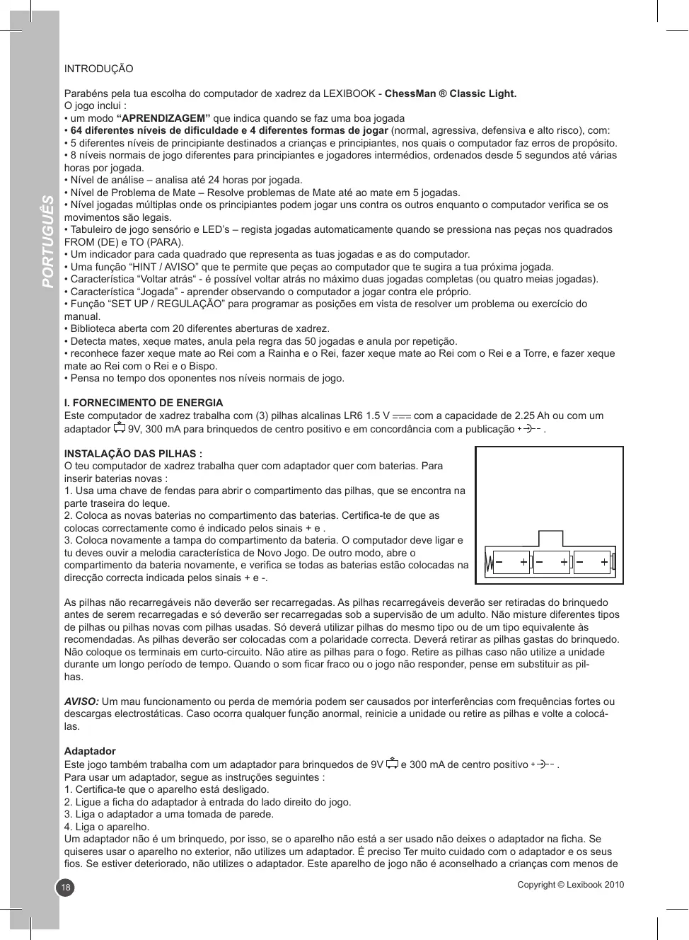 1. Ouvrez le couvercle du compartiment à piles à l’aide d’un tournevis. 2. Installez 3 piles LR6 de 1,5 V en respectant le sens des polarités indiqué au fond du compartiment. 3. Refermez le compartiment à piles. Vous devez alors entendre la petite musique annonçant une nouvelle partie. Dans le cas contraire, ouvrez à nouveau le compartiment à piles et vérifiez que les piles sont correctement installées. Ne pas recharger les piles non rechargeables. Retirer les accumulateurs du jeu avant de les recharger. Ne charger les accumulateurs que sous la surveillance d’un adulte. Ne pas mélanger différents types de piles ou accumulateurs, ou des piles et accumulateurs neufs et usagés. Les piles et accumulateurs doivent être mis en place en respectant la polarité. Les piles et accumulateurs usagés doivent être enlevés du jouet. Les bornes d’une pile ou d’un accumulateur ne doivent pas être mises en court-circuit. Ne pas jeter les piles au feu. Retirer les piles en cas de non utilisation prolongée. ATTENTION : D’importantes interférences électromagnétiques ou des décharges électrostatiques peuvent provoquer un dysfonctionnement ou une perte de données. Si le produit ne fonctionne pas correctement, enlevez puis remettez les piles. Adaptateur Le jeu fonctionne aussi avec un adaptateur pour jouets de 9 V , 300 mA, à centre positif . Pour le branchement, suivez ces instructions : 1. Assurez-vous que l’appareil est éteint. 2. Branchez la fiche de l’adaptateur dans la prise située sur le côté droit du jeu. 3. Branchez l’adaptateur dans une prise de courant. 4. Mettez le jeu en marche. Débranchez l’adaptateur en cas de non-utilisation prolongée afin d’éviter tout échauffement. Lorsque le jeu est alimenté par un adaptateur, ne jouez pas à l’extérieur. Vérifiez régulièrement l’état de l’adaptateur et des fils de branchement. En cas de détérioration, n’utilisez pas l’adaptateur jusqu’à réparation. Le jeu ne doit être utilisé qu’avec l’adaptateur recommandé. Copyright © Lexibook 2010