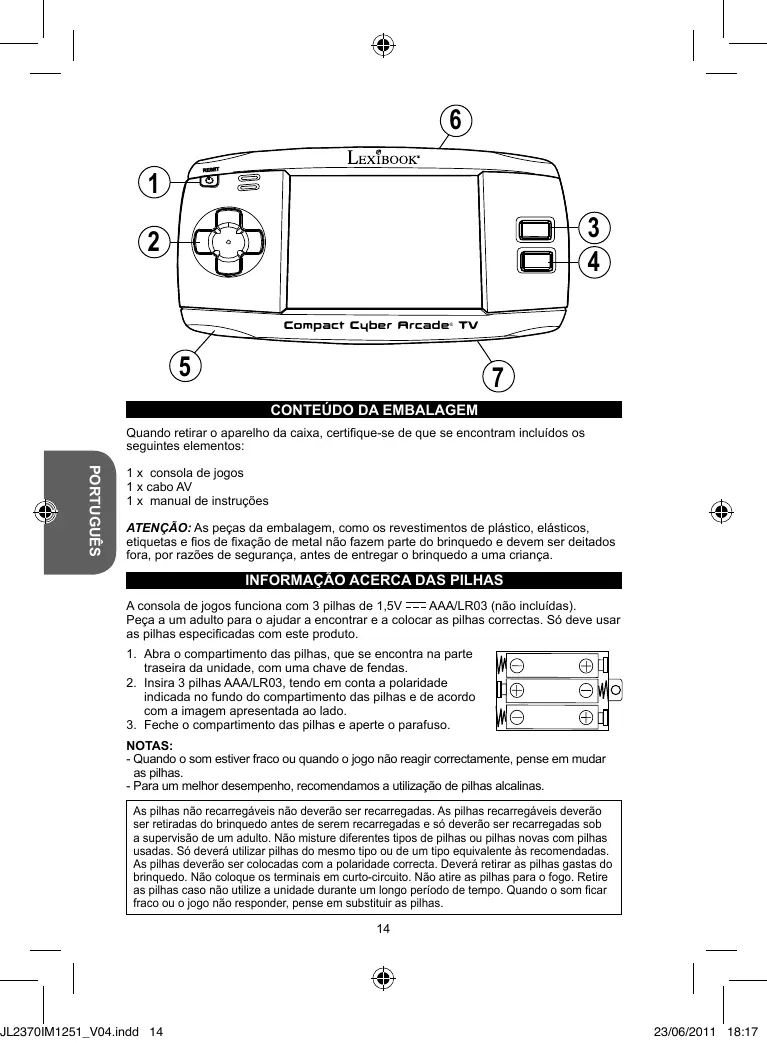 NOTAS: - Quando o som estiver fraco ou quando o jogo não reagir correctamente, pense em mudar as pilhas. - Para um melhor desempenho, recomendamos a utilização de pilhas alcalinas. As pilhas não recarregáveis não deverão ser recarregadas. As pilhas recarregáveis deverão ser retiradas do brinquedo antes de serem recarregadas e só deverão ser recarregadas sob a supervisão de um adulto. Não misture diferentes tipos de pilhas ou pilhas novas com pilhas usadas. Só deverá utilizar pilhas do mesmo tipo ou de um tipo equivalente às recomendadas. As pilhas deverão ser colocadas com a polaridade correcta. Deverá retirar as pilhas gastas do brinquedo. Não coloque os terminais em curto-circuito. Não atire as pilhas para o fogo. Retire as pilhas caso não utilize a unidade durante um longo período de tempo. Quando o som ficar fraco ou o jogo não responder, pense em substituir as pilhas. JL2370IM1251_V04.indd 14