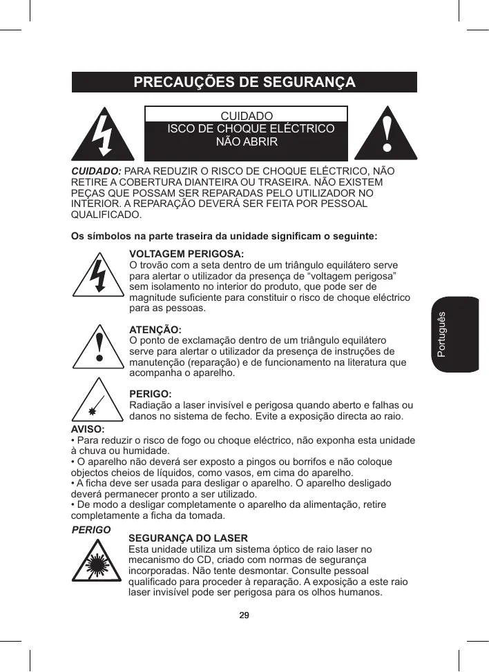 Le point d’exclamation à l’intérieur du triangle permet d’alerter l’utilisateur de la présence d’instructions d’opération et d’entretien importantes accompagnant le produit. DANGER : Des radiations laser invisibles sont émises si l’appareil est ouvert ou si le mécanisme de fermeture dysfonctionne. Evitez toute exposition au rayon.