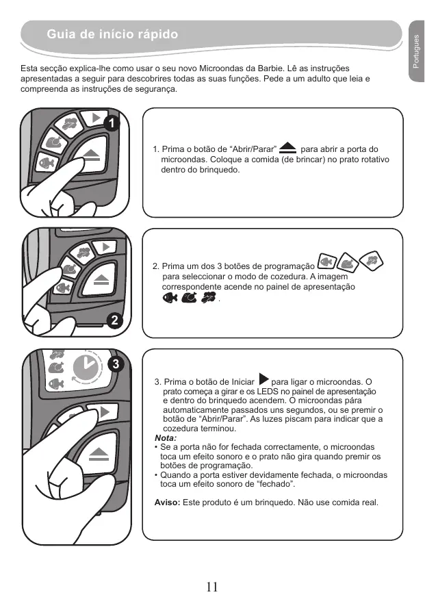 Esta secção explica-lhe como usar o seu novo Microondas da Barbie. Lê as instruções apresentadas a seguir para descobrires todas as suas funções. Pede a um adulto que leia e compreenda as instruções de segurança.