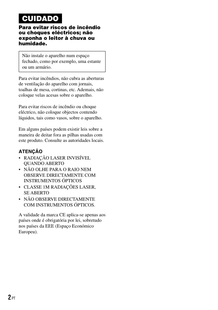 2)AVLS son las siglas de Automatic Volume Limiter System (Sistema de limitación automática del volumen). Afin d’éviter tout risque d’incendie, ne pas couvrir les ailettes de ventilation de cet appareil avec des journaux, des nappes, des rideaux, etc. Ne pas poser de bougies allumées sur l’appareil. Afin d’éviter tout risque d’incendie et d’électrocution, ne pas poser d’objets remplis de liquide, vases ou autre, sur l’appareil. INFORMATION A pleine puissance, l’écoute prolongée du baladeur peut endommager l’oreille de l’utilisateur. ATTENTION L’utilisation d’instruments optiques avec ce produit augmente les risques pour les yeux. Certains pays peuvent appliquer des dispositions différentes pour l’élimination des piles qui alimentent ce produit. Veuillez consulter vos autorités locales. PRECAUTIONS • UN RAYONNEMENT LASER INVISIBLE EST EMIS LORSQUE L’APPAREIL EST OUVERT • NE PAS REGARDER LE RAYON LASER FIXEMENT NI DIRECTEMENT AVEC DES INSTRUMENTS D’OPTIQUE • UN RAYONNEMENT LASER INVISIBLE DE CLASSE 1M EST EMIS LORSQUE L’APPAREIL EST OUVERT • NE PAS REGARDER DIRECTEMENT AVEC DES INSTRUMENTS D’OPTIQUE