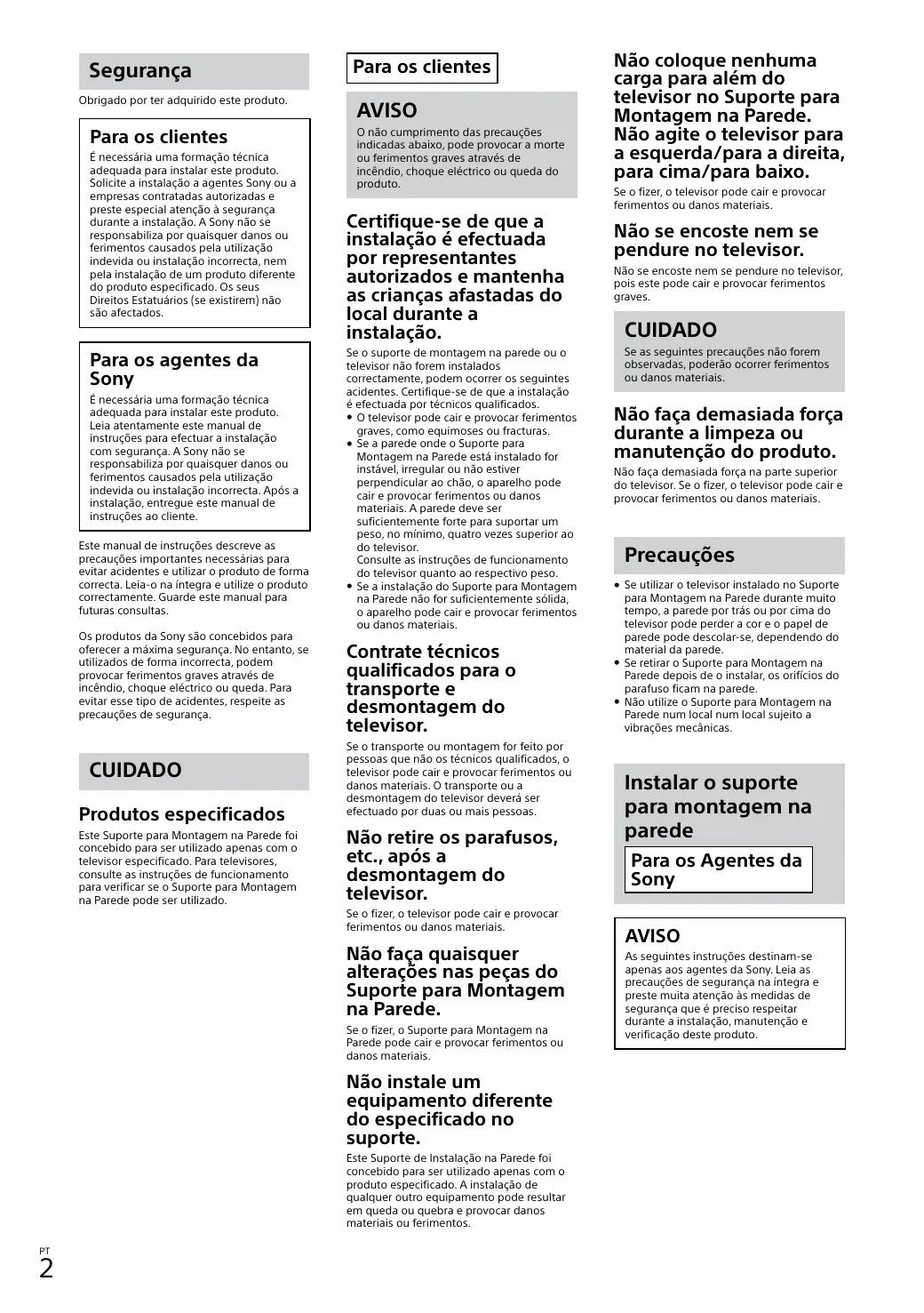 Baixe as instruções para o seu Suporte de parede para TV em formato PDF gratuitamente! Encontre o seu manual SU-WL450 - SONY e retome o controlo do seu dispositivo eletrónico. Nesta página estão publicados todos os documentos necessários para a utilização do seu dispositivo. SU-WL450 da marca SONY.