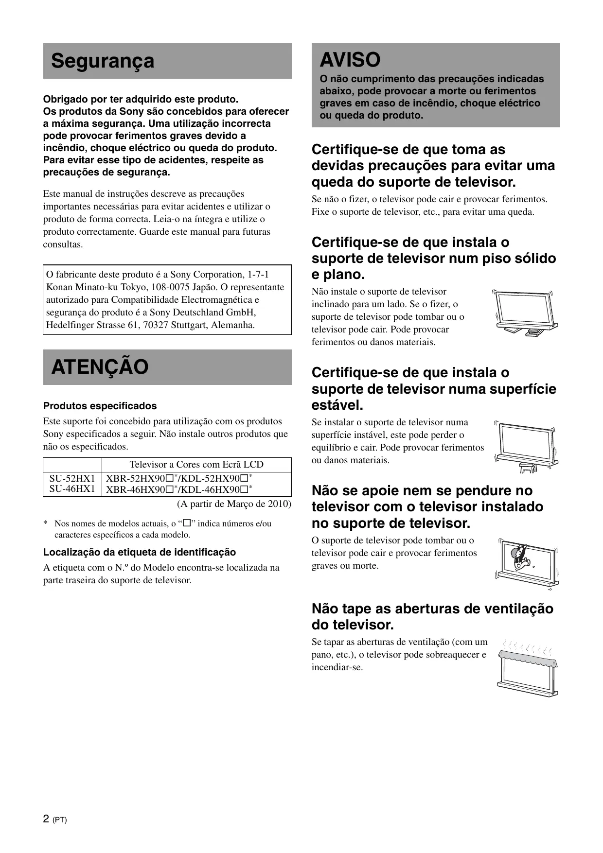 8 (PL) Segurança Obrigado por ter adquirido este produto. Os produtos da Sony são concebidos para oferecer a máxima segurança. Uma utilização incorrecta pode provocar ferimentos graves devido a incêndio, choque eléctrico ou queda do produto. Para evitar esse tipo de acidentes, respeite as precauções de segurança. Este manual de instruções descreve as precauções importantes necessárias para evitar acidentes e utilizar o produto de forma correcta. Leia-o na íntegra e utilize o produto correctamente. Guarde este manual para futuras consultas. O fabricante deste produto é a Sony Corporation, 1-7-1 Konan Minato-ku Tokyo, 108-0075 Japão. O representante autorizado para Compatibilidade Electromagnética e segurança do produto é a Sony Deutschland GmbH, Hedelfinger Strasse 61, 70327 Stuttgart, Alemanha. ATENÇÃO Produtos especificados Este suporte foi concebido para utilização com os produtos Sony especificados a seguir. Não instale outros produtos que não os especificados. SU-52HX1 SU-46HX1 Televisor a Cores com Ecrã LCD XBR-52HX90s*/KDL-52HX90s* XBR-46HX90s*/KDL-46HX90s* (A partir de Março de 2010)