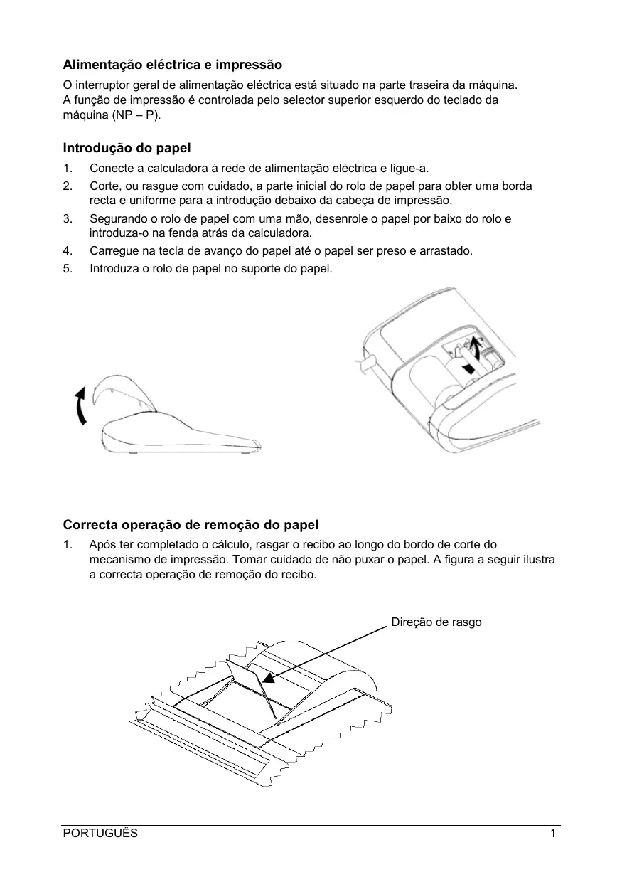 Após ter completado o cálculo, rasgar o recibo ao longo do bordo de corte do mecanismo de impressão. Tomar cuidado de não puxar o papel. A figura a seguir ilustra a correcta operação de remoção do recibo. Direção de rasgo PORTUGUÊS
